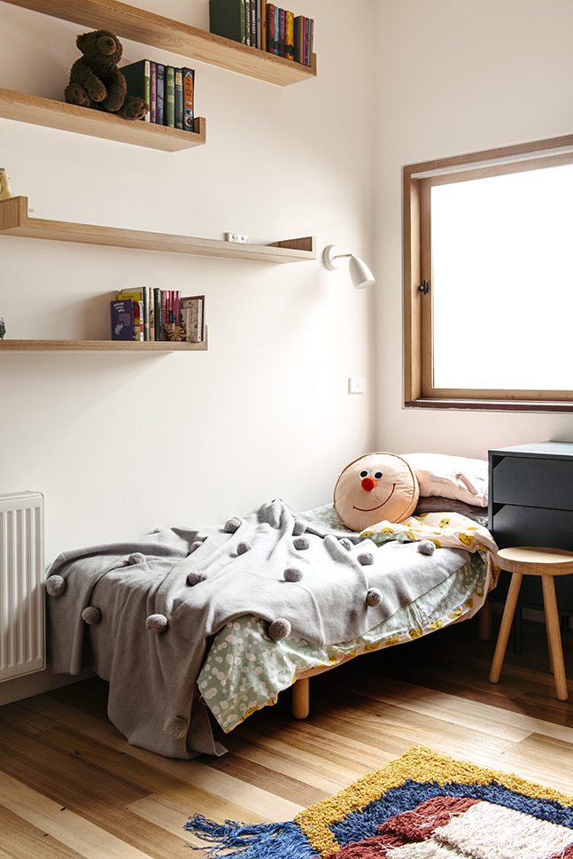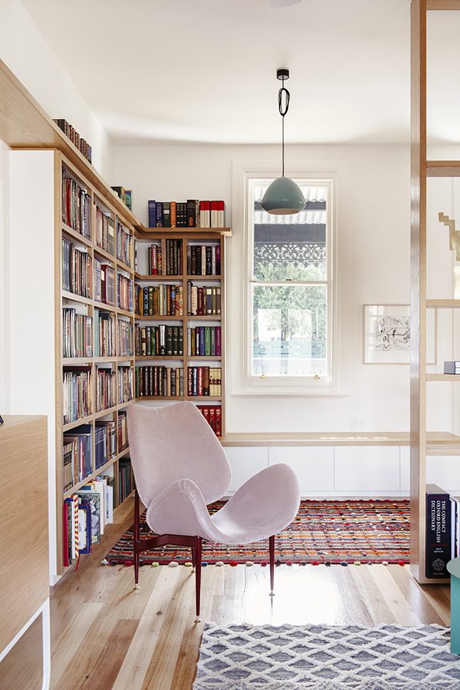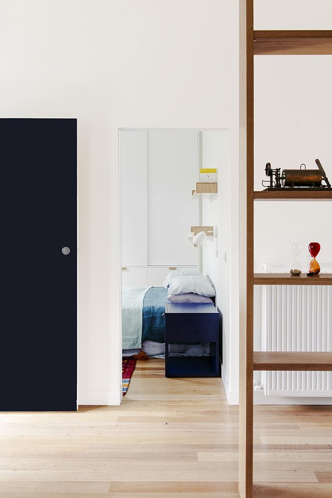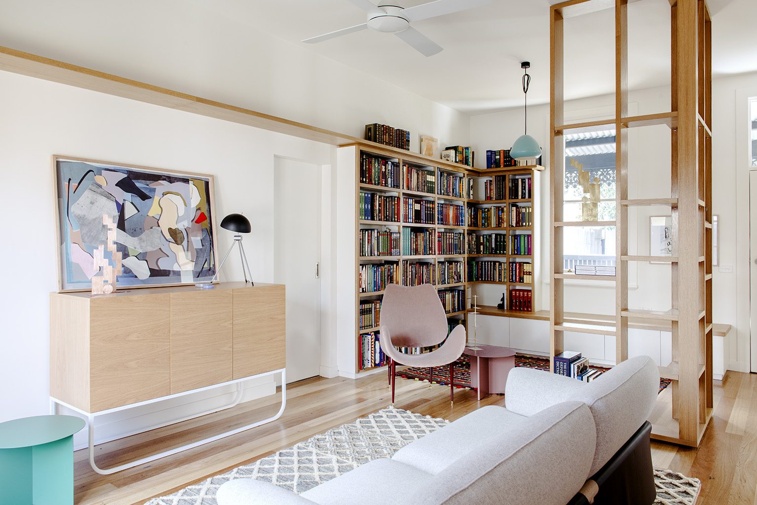 The site was small and intimate – which steered a lot of the functionality in the in-built joinery; as every opportunity to create storage was taken, including space for an extremely large book collection. Being a family with two little girls all the spaces have been designed to be fluid and expansive, with each sliding door disappearing to create an open space yet providing the option of closing down each room to create private nooks – for when that solitude is necessary. The girls’ room is separated by a large timber veneered siding door, allowing privacy as the girls grow older but providing them with the bonding needed during their younger years.