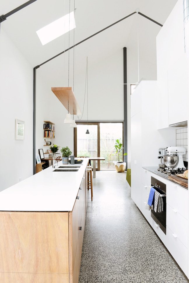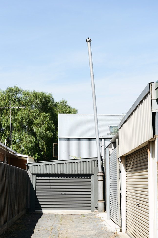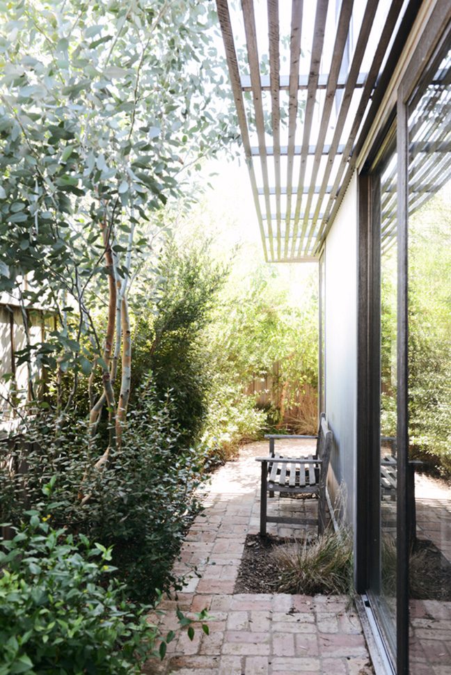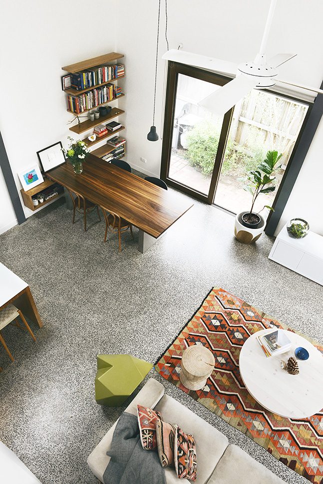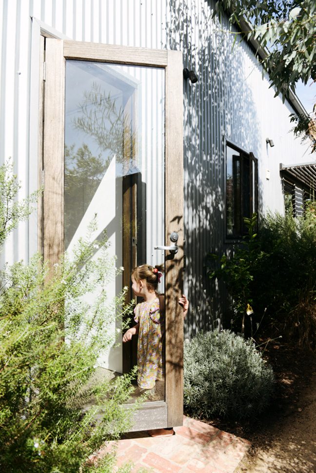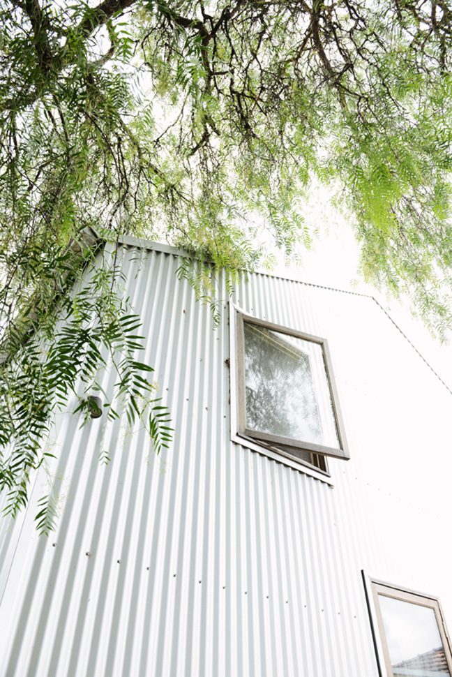 This cute little barn is tucked behind a neighbouring garage at the end of a no-through road. It’s so peaceful and quiet there – nestled between all the nonna’s backyards -and only moments from Sydney Rd and Lygon Street. The house is tiny, with a footprint of 100sqm. To make it feel more spacious, it has 6m tall pitched ceilings and a mezzanine over the bedrooms and bathroom. Clear roof windows in the ceiling allow you to see the sky from everywhere in the house – a real rarity in Brunswick! A beautiful native garden has been planted around the shed, softening its industrial look.