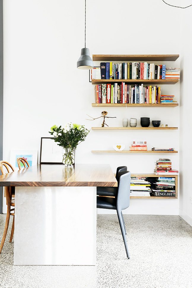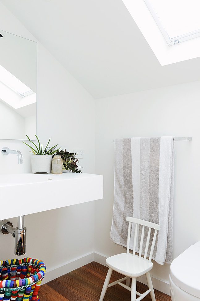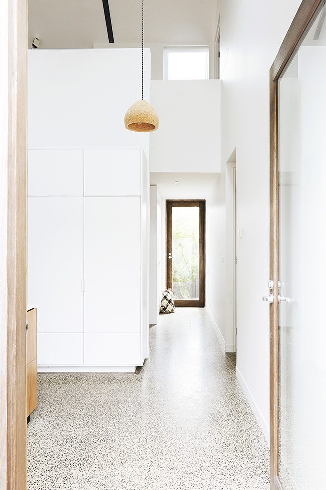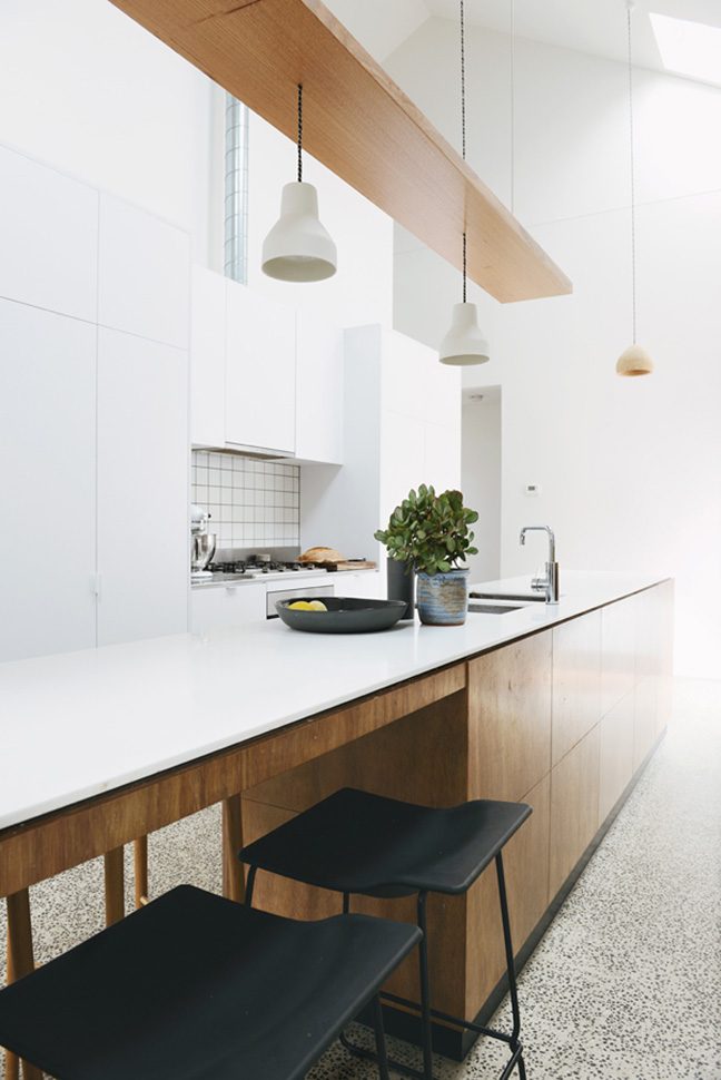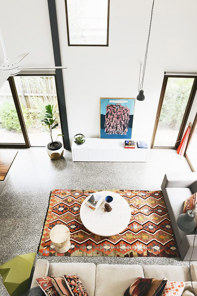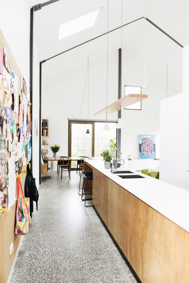 This cute little barn is tucked behind a neighbouring garage at the end of a no-through road. It’s so peaceful and quiet there – nestled between all the nonna’s backyards -and only moments from Sydney Rd and Lygon Street. The house is tiny, with a footprint of 100sqm. To make it feel more spacious, it has 6m tall pitched ceilings and a mezzanine over the bedrooms and bathroom. Clear roof windows in the ceiling allow you to see the sky from everywhere in the house – a real rarity in Brunswick! A beautiful native garden has been planted around the shed, softening its industrial look.