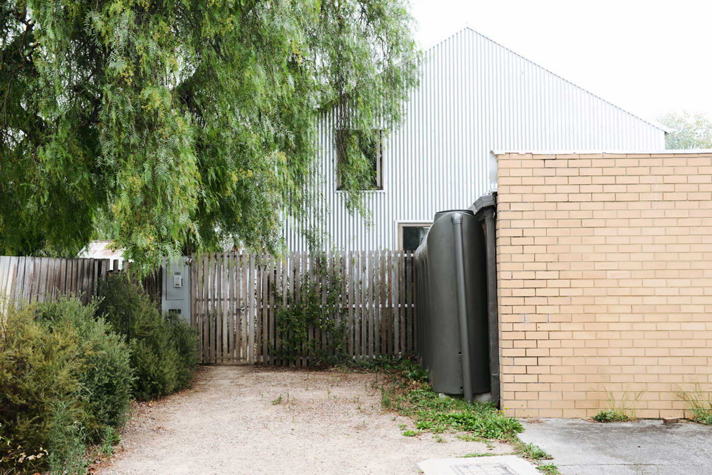This cute little barn is tucked behind a neighbouring garage at the end of a no-through road. It’s so peaceful and quiet there – nestled between all the nonna’s backyards -and only moments from Sydney Rd and Lygon Street. The house is tiny, with a footprint of 100sqm. To make it feel more spacious, it has 6m tall pitched ceilings and a mezzanine over the bedrooms and bathroom. Clear roof windows in the ceiling allow you to see the sky from everywhere in the house – a real rarity in Brunswick! A beautiful native garden has been planted around the shed, softening its industrial look.