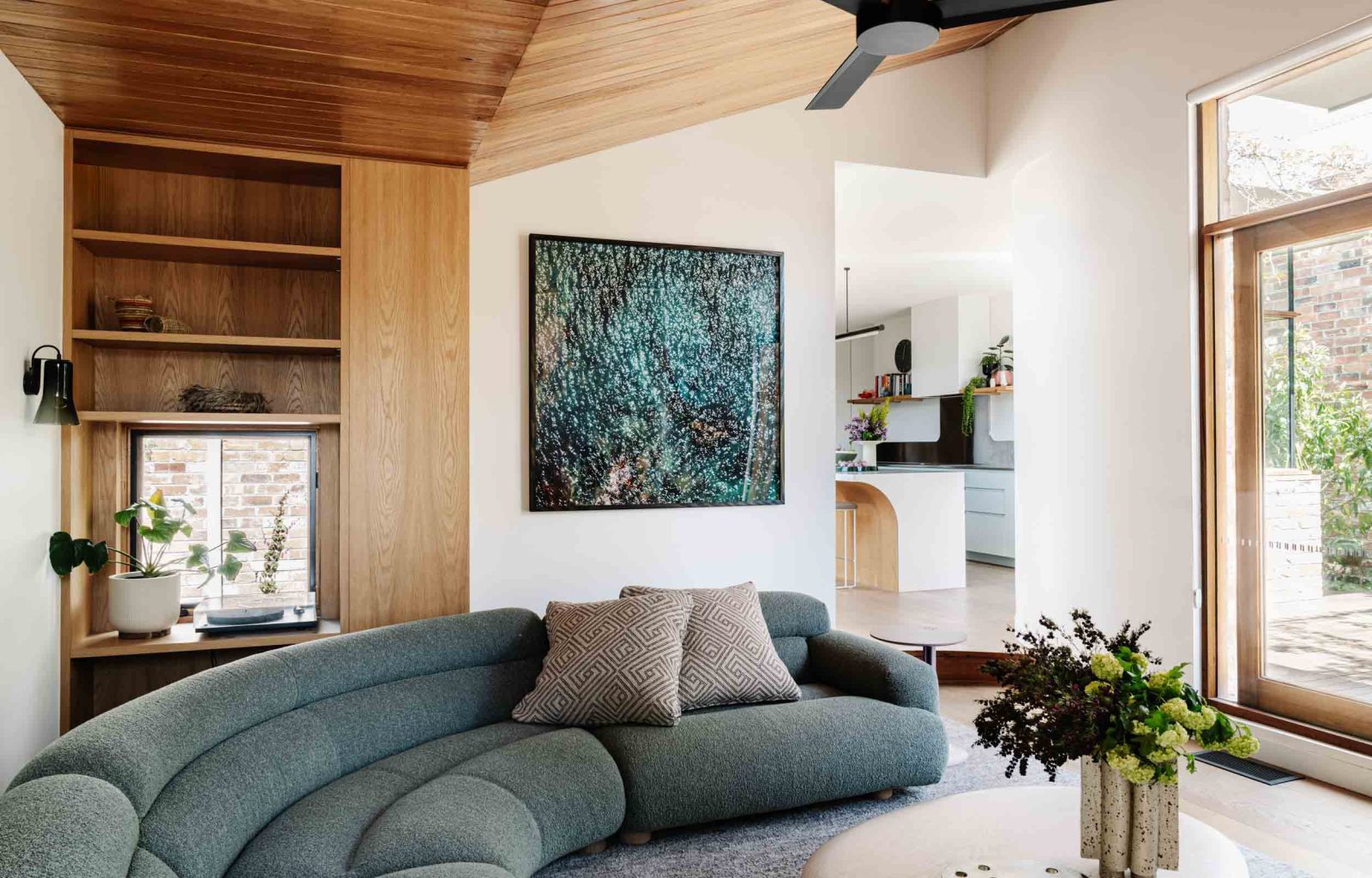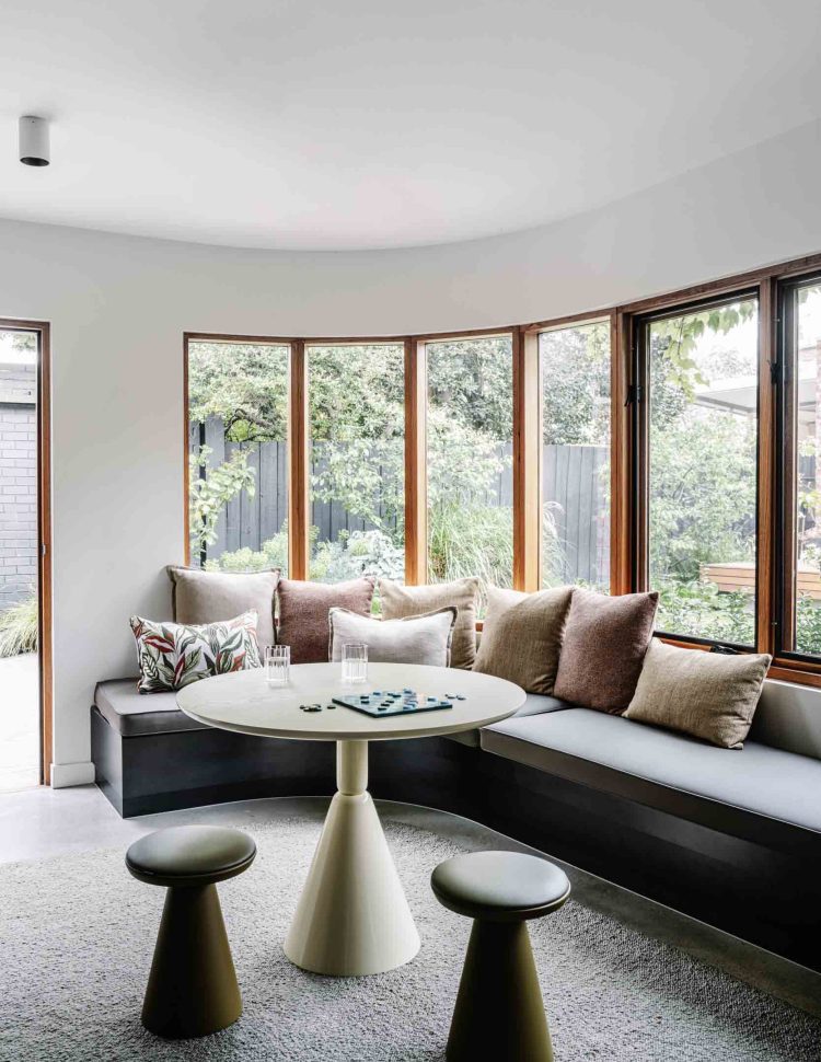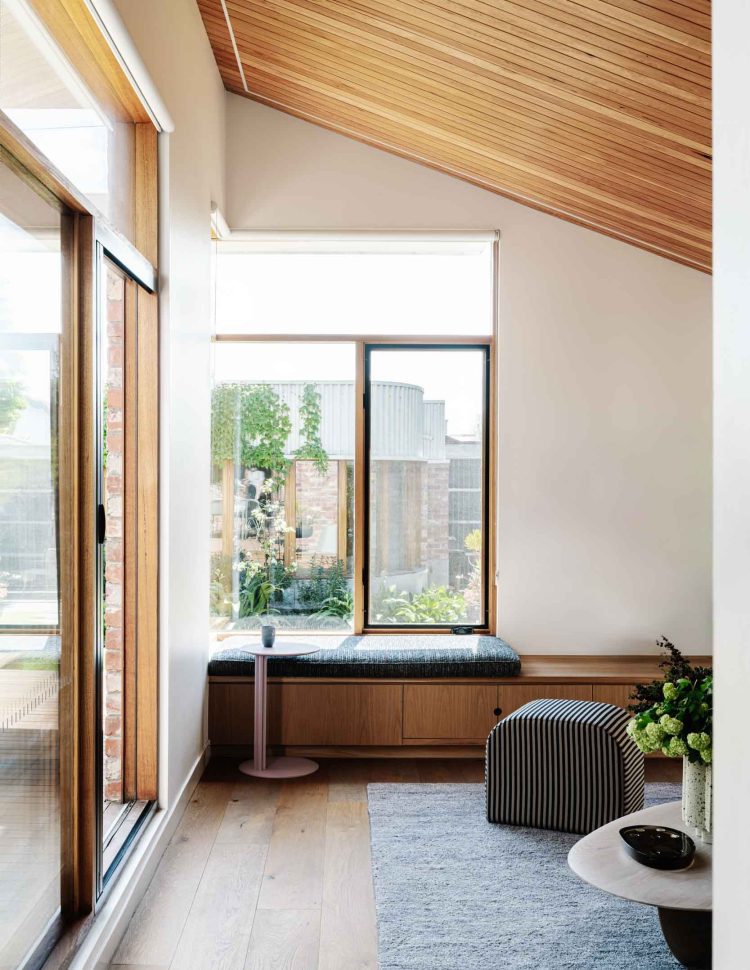 Rather than fully opening the house to the backyard, the design features a sunken living area that creates a cozy, nestled feeling and frames views of the outdoor space.