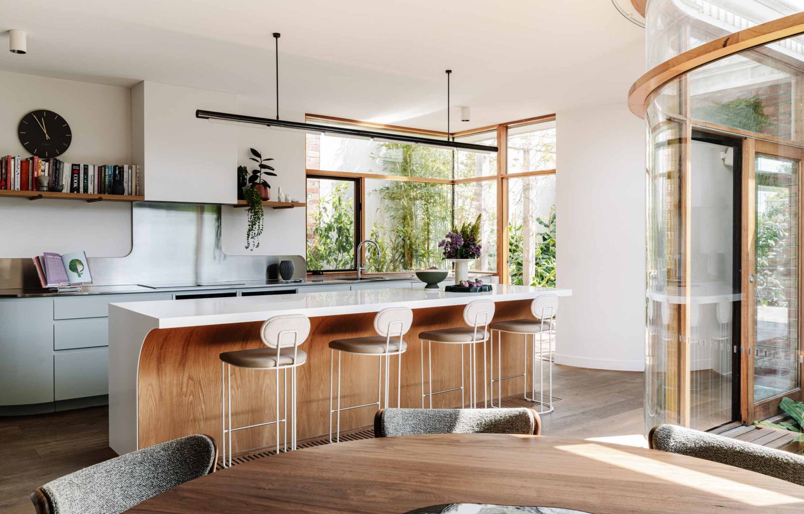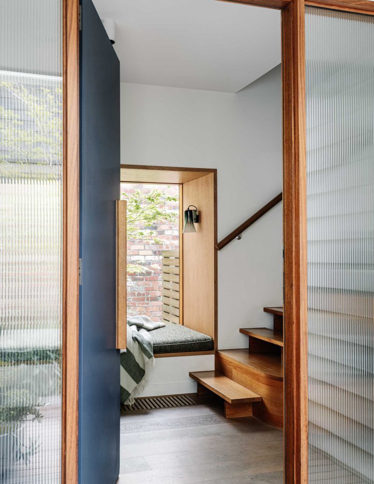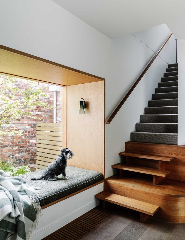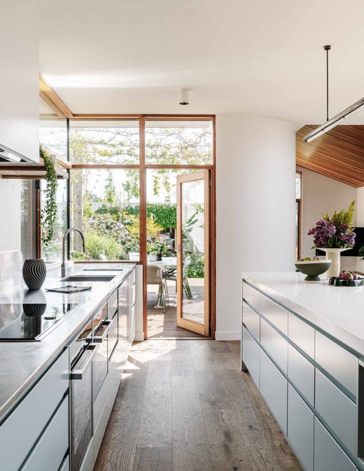 Small courtyards around the perimeter of the house allow sunlight to penetrate deep into the interior. Numerous built-in joinery elements help the spaces flow into one another while maintaining their distinct identities. A small studio located in the backyard accommodates guests, provides additional space as the children grow, or serves as a workspace when needed.