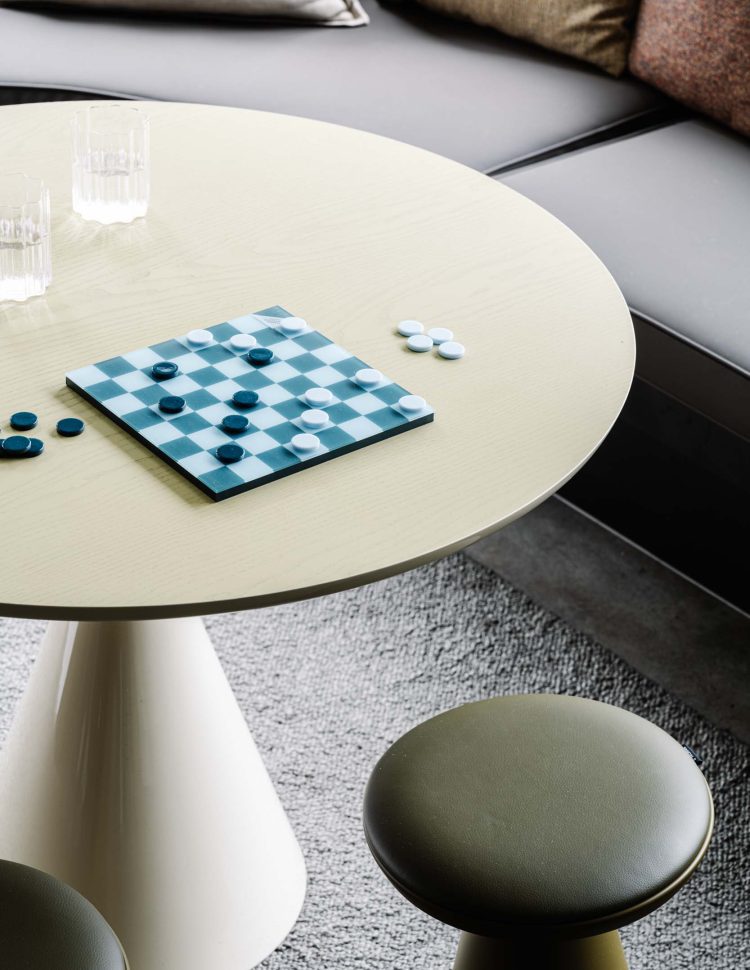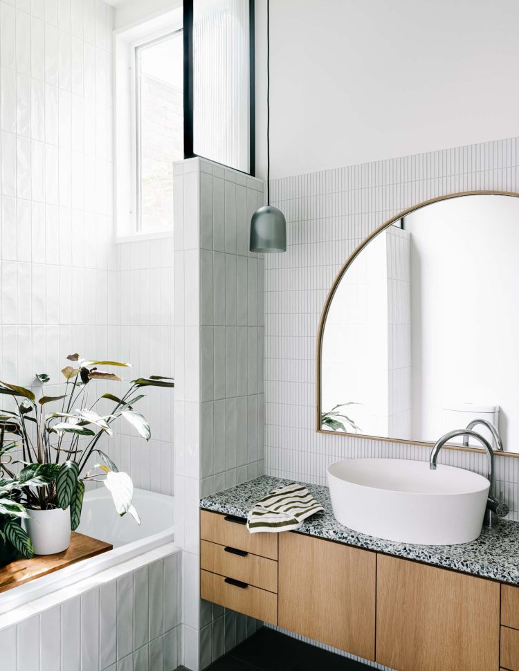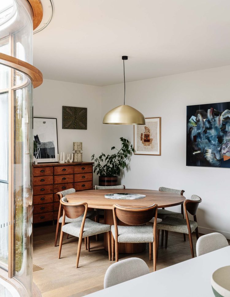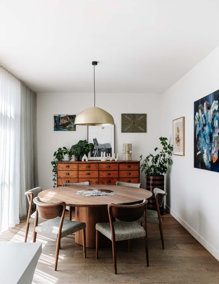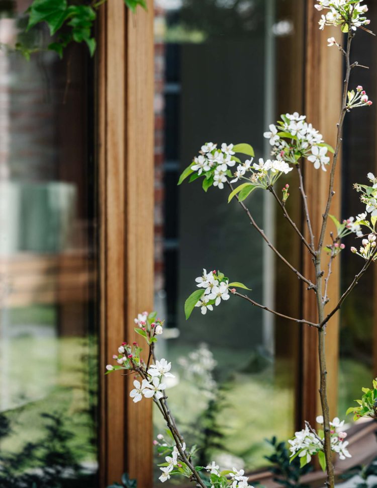 Small courtyards around the perimeter of the house allow sunlight to penetrate deep into the interior. Numerous built-in joinery elements help the spaces flow into one another while maintaining their distinct identities. A small studio located in the backyard accommodates guests, provides additional space as the children grow, or serves as a workspace when needed.
