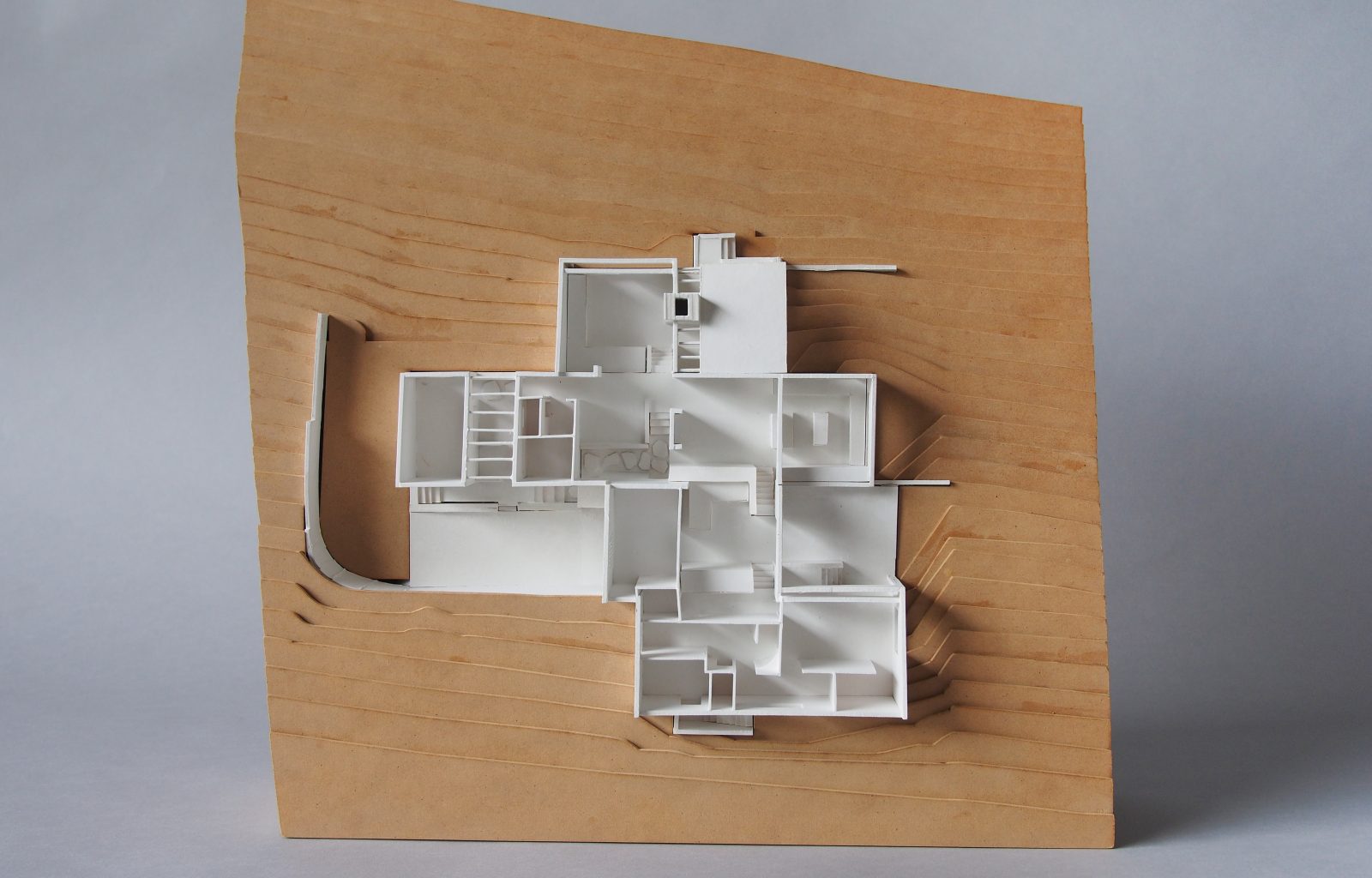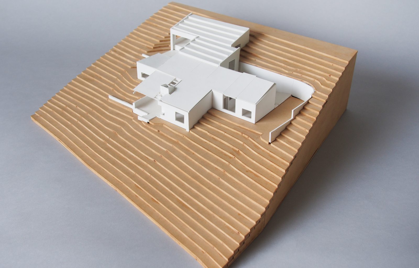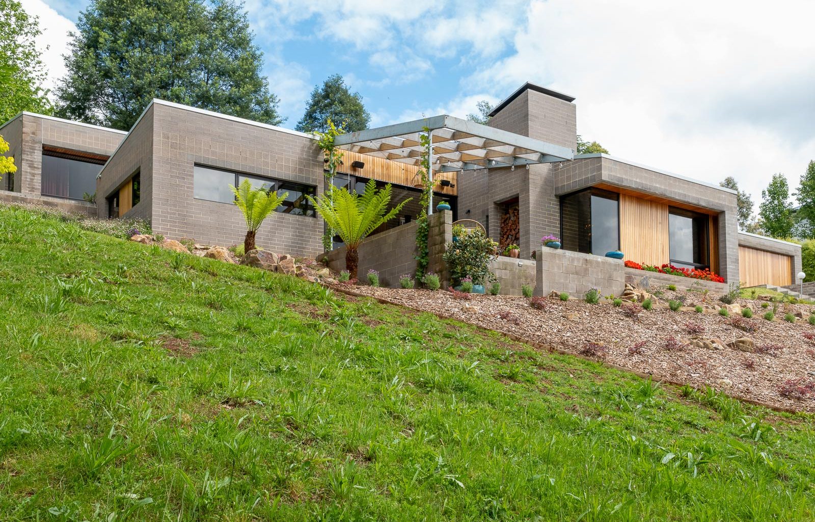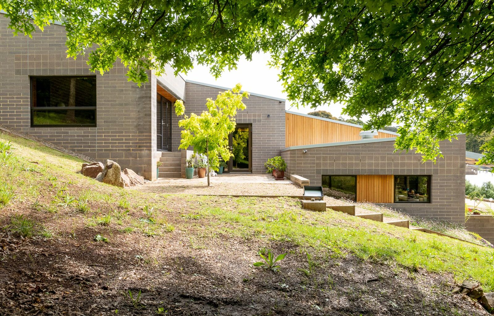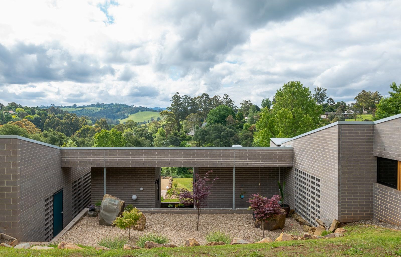 The house is situated on a sloping site on the outskirts of Melbourne, overlooking a scenic valley. The house consists of three linear volumes that follow the contour of the land and are connected by stairs and courtyards.