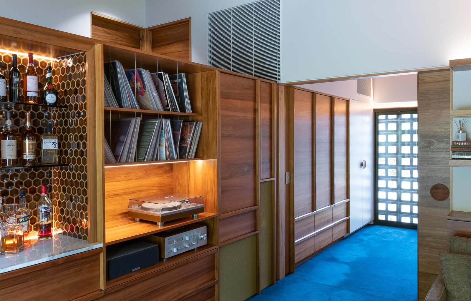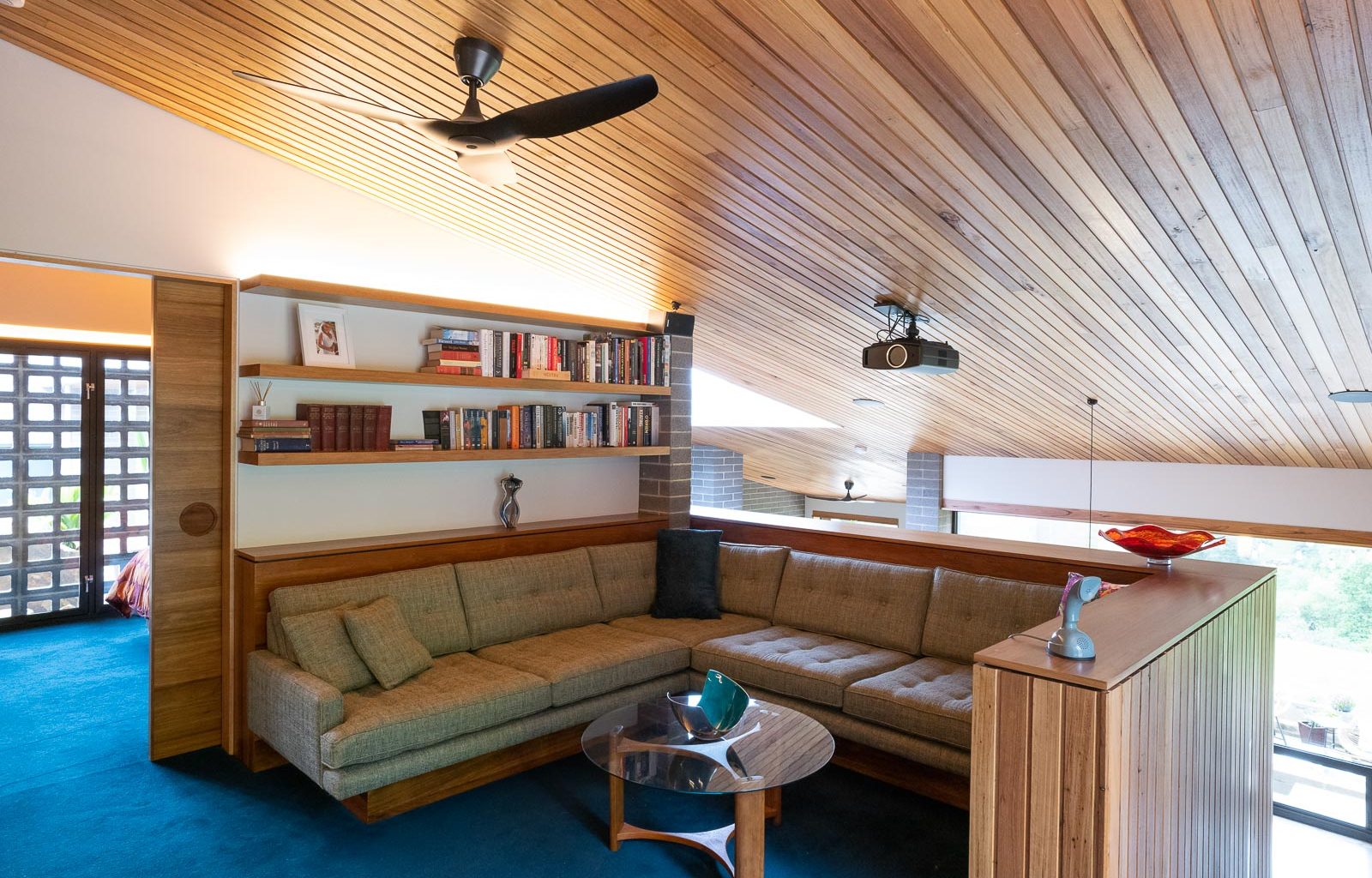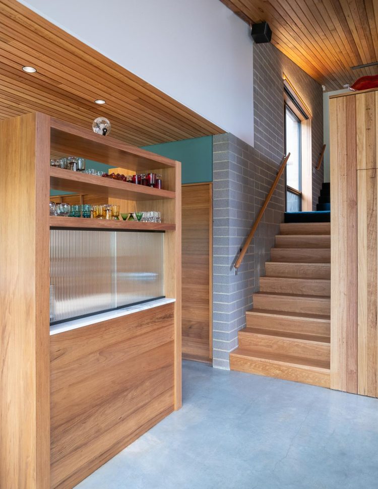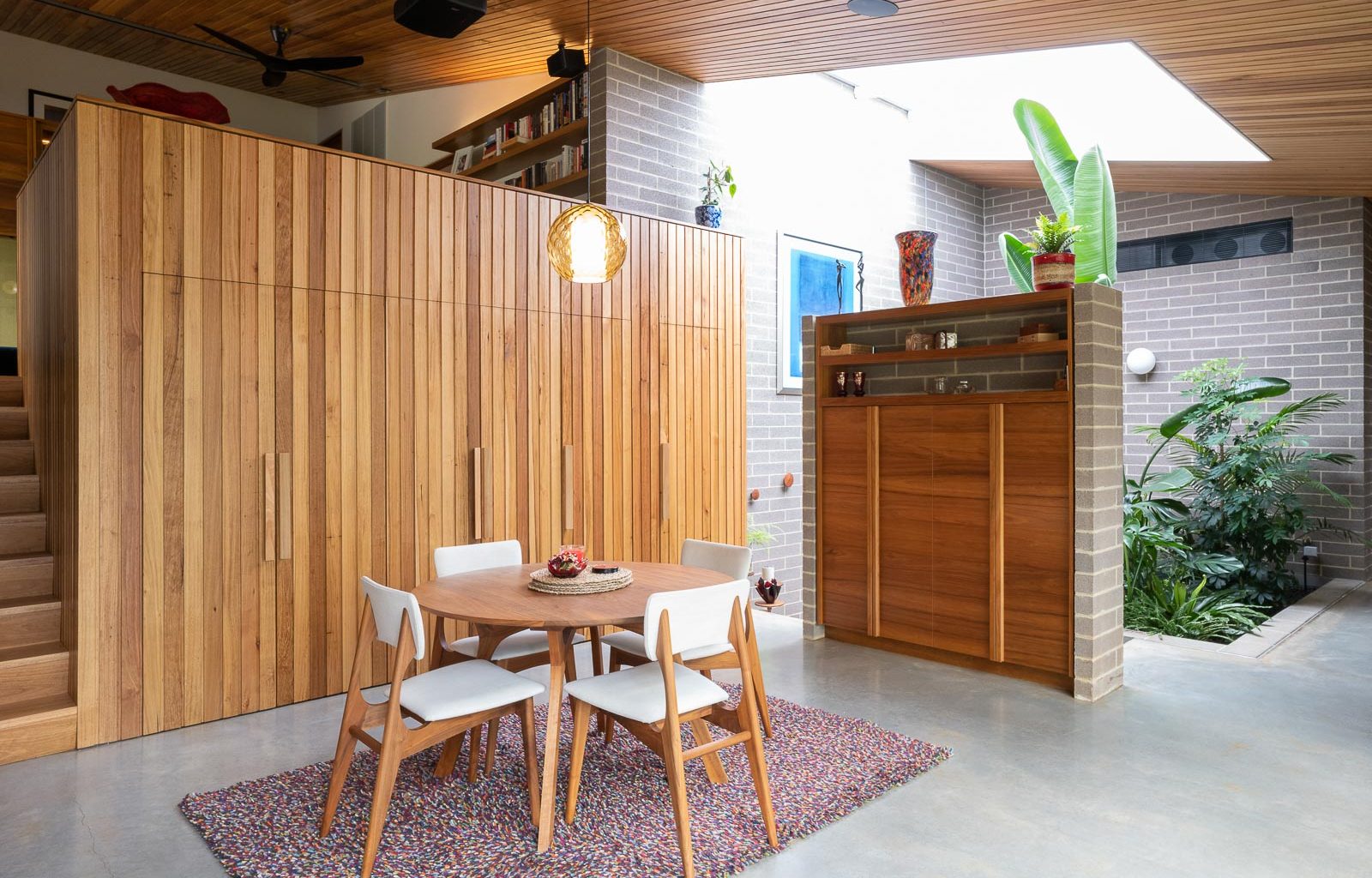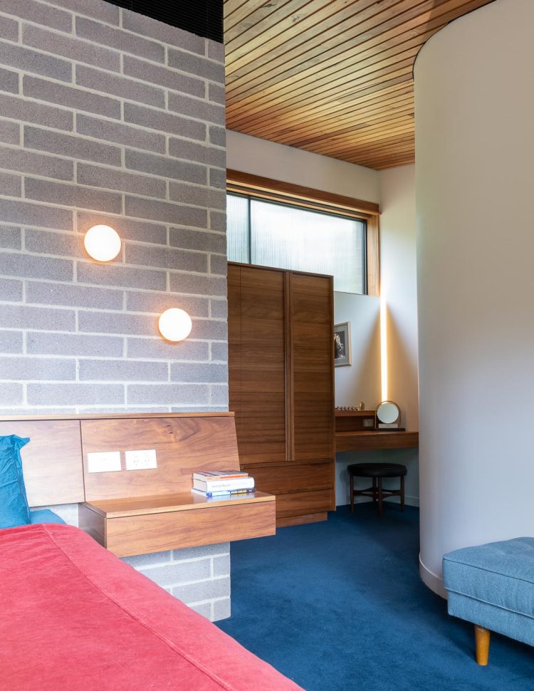 The house’s interior features built-in timber furniture that adds warmth and elegance. The timber also covers the ceiling and contrasts with the concrete floor. The textured masonry walls reflect the soft light from the timber ceiling and create a cosy atmosphere.