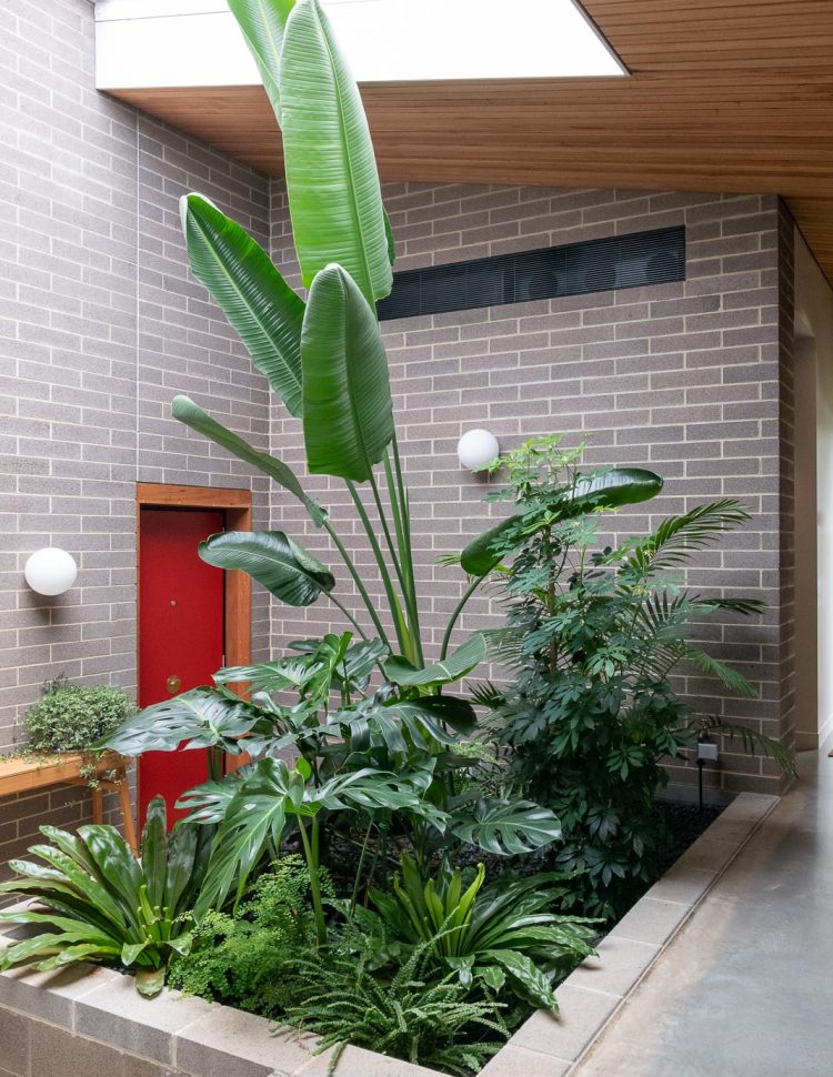 One of these courtyards is at the heart of the house, next to the main entrance. Its translucent roof lets natural light flood into the house’s core and creates a lush indoor garden.