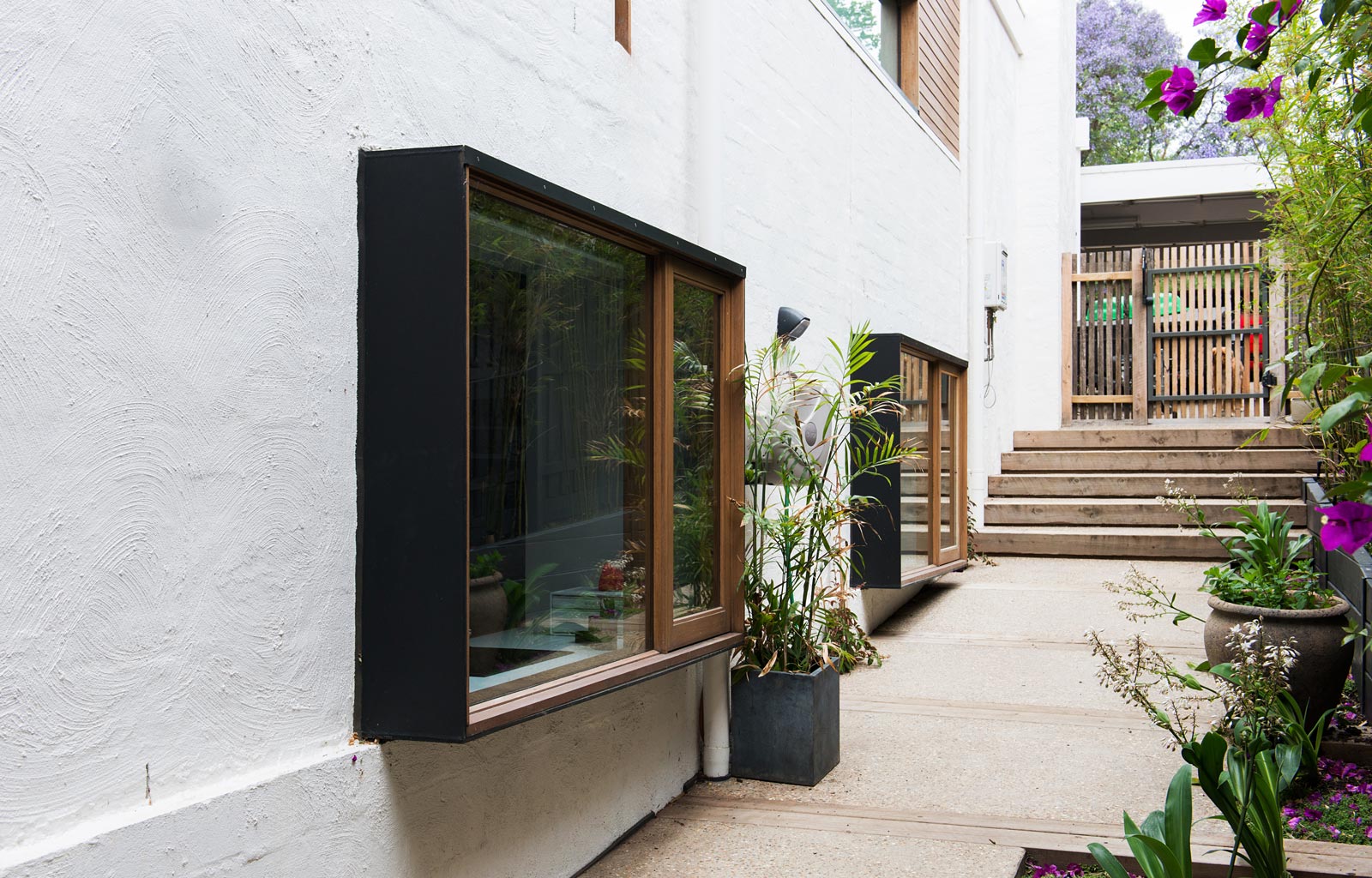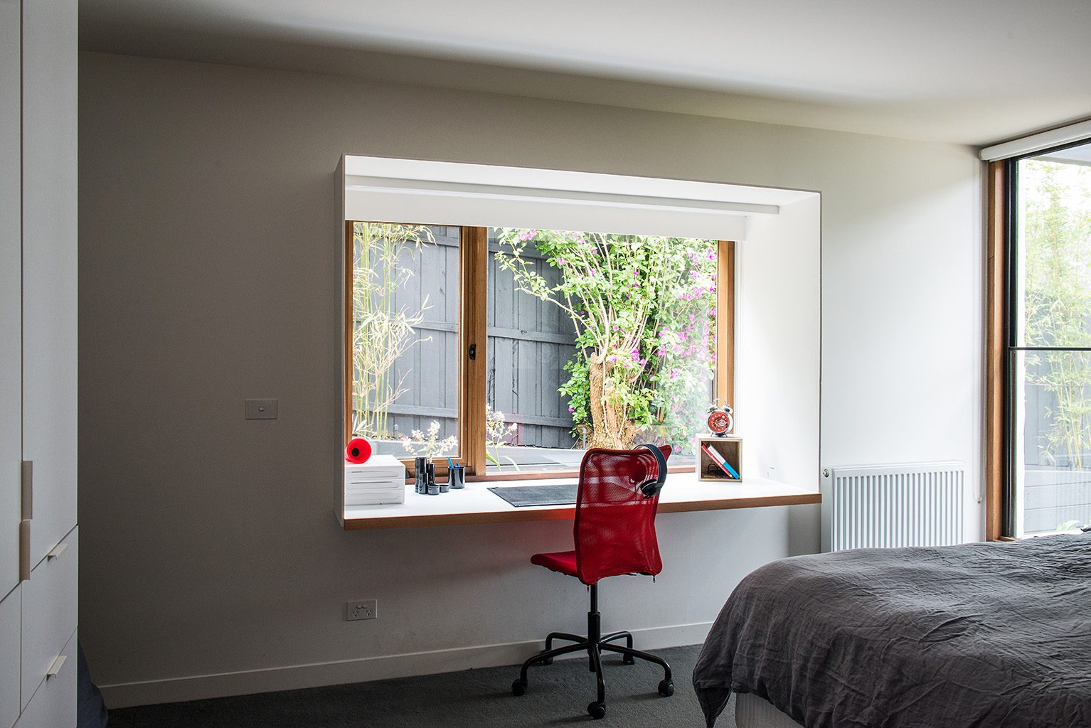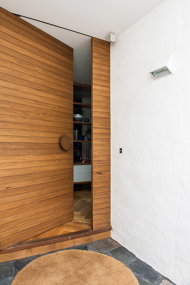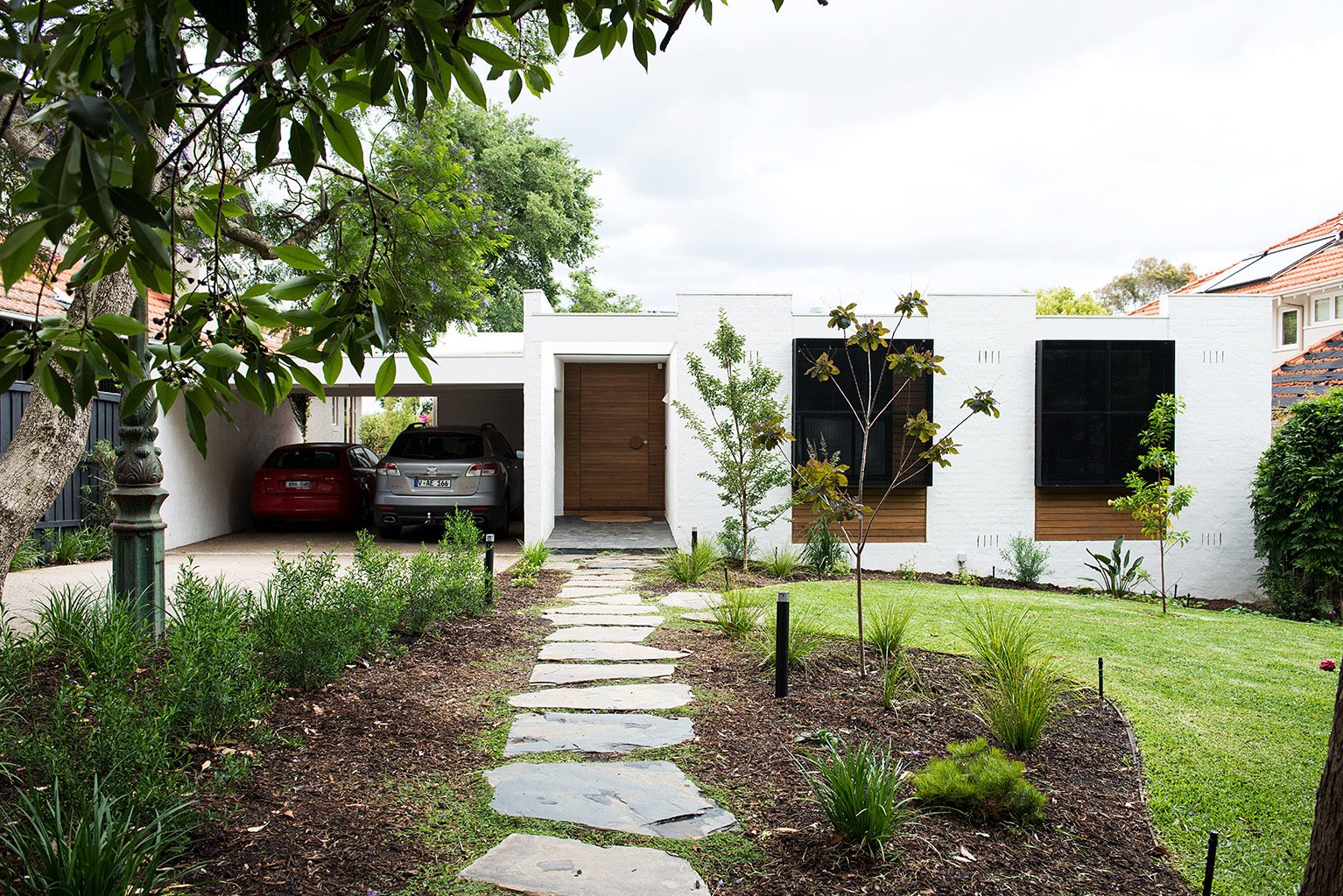 The front of the house remains mostly unchanged, with the only updates being the application of cement bagging and a fresh coat of paint on the original brown brick walls. The existing two windows have been remodeled with perforated screens to obscure views into and out of an ensuite bathroom and a dressing room. A large timber-lined front door marks the entrance and leads to an internal circular skylight.