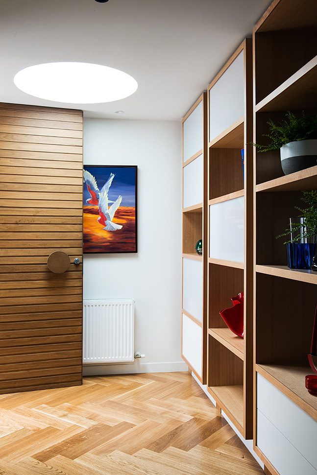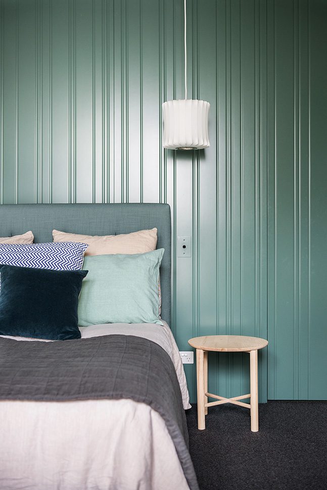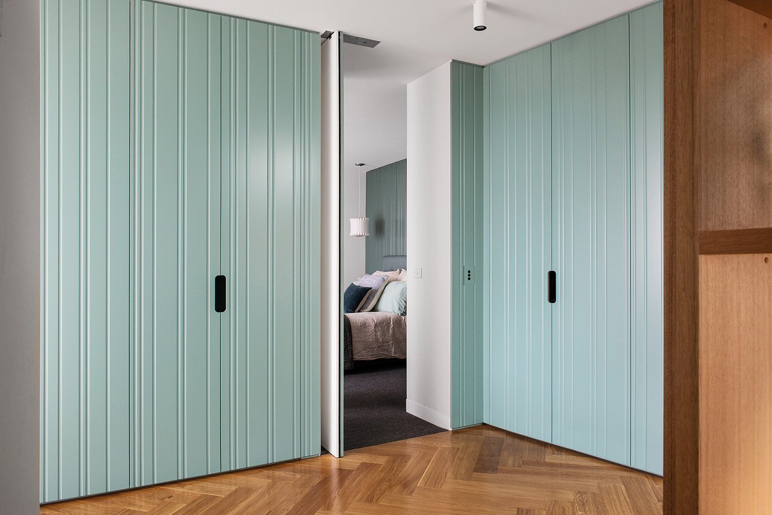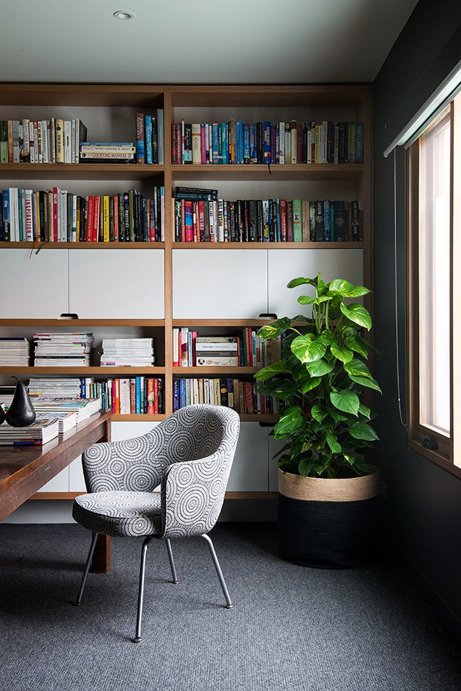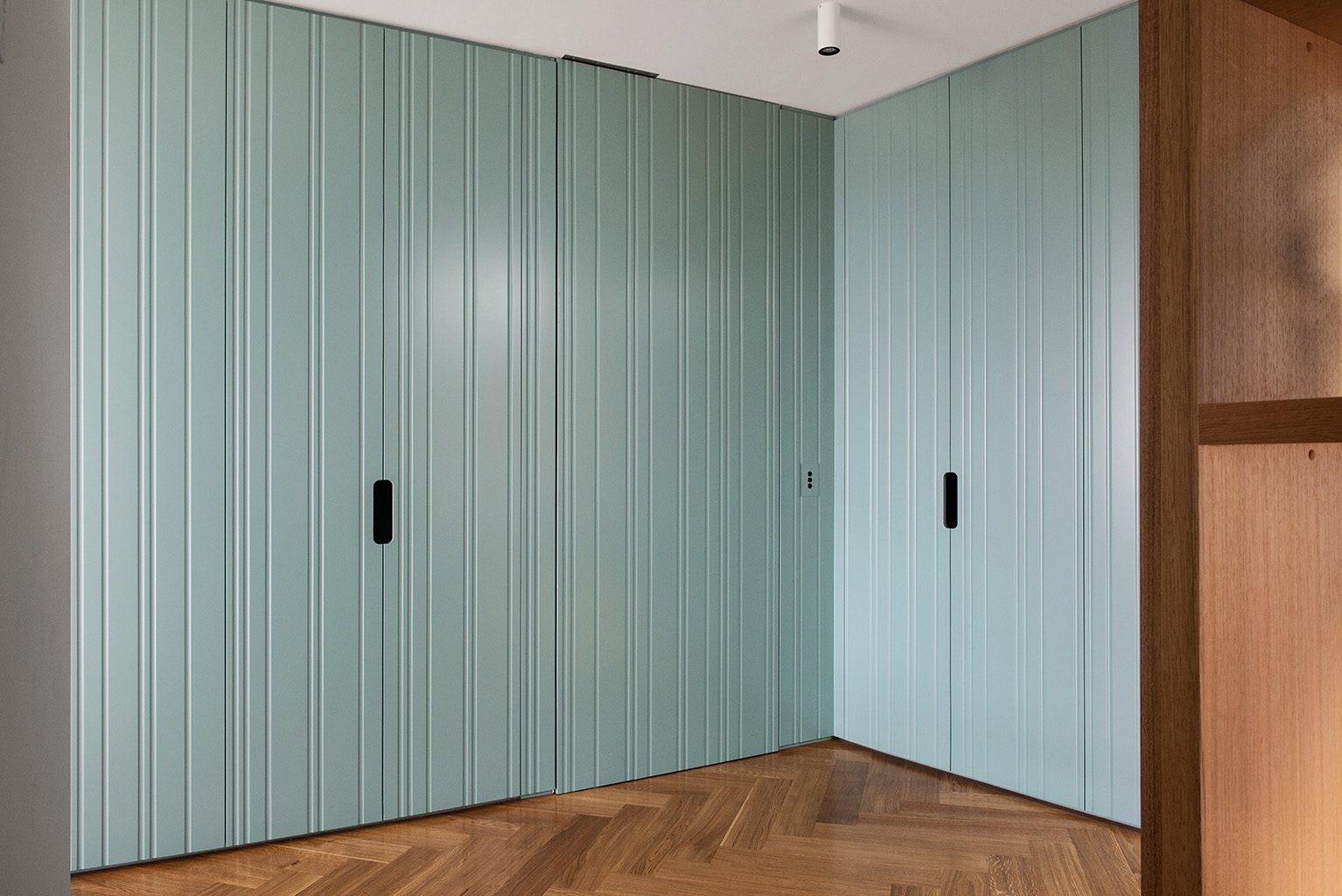 The front of the house remains mostly unchanged, with the only updates being the application of cement bagging and a fresh coat of paint on the original brown brick walls. The existing two windows have been remodeled with perforated screens to obscure views into and out of an ensuite bathroom and a dressing room. A large timber-lined front door marks the entrance and leads to an internal circular skylight.