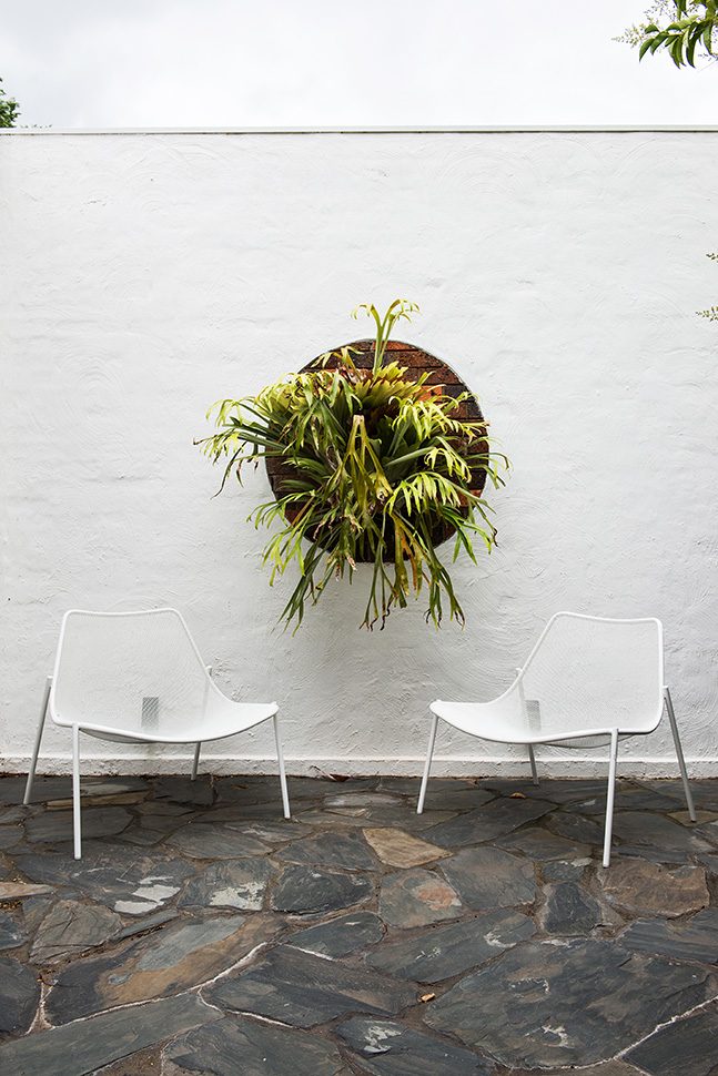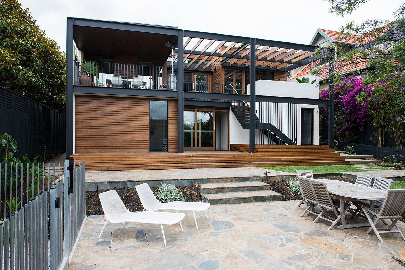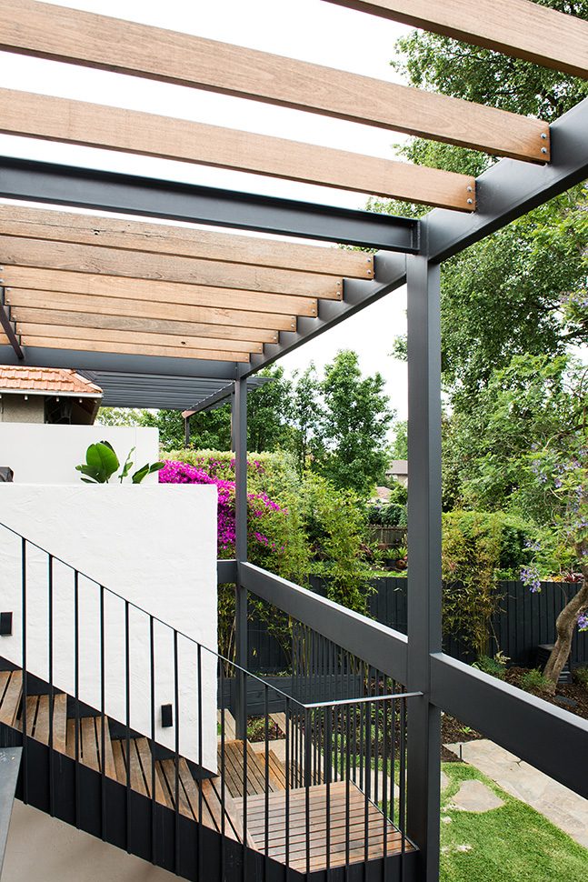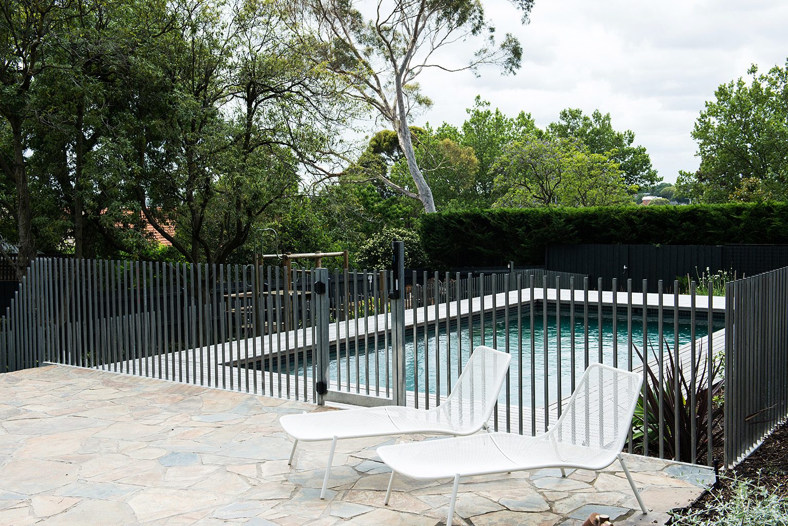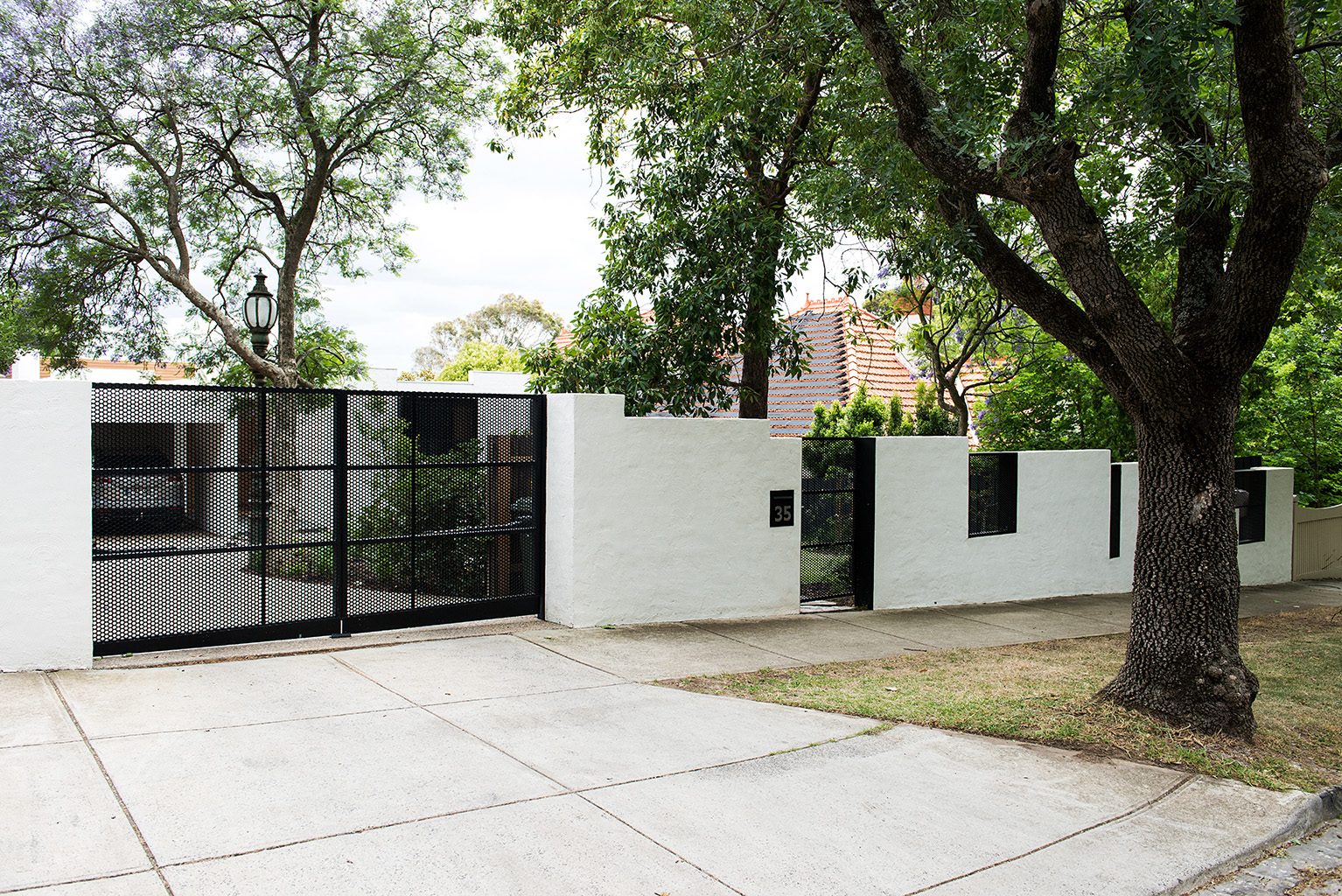 The project begins with the front fence, which has been cut and shaped to accommodate new metal perforated screens. These screens provide views into and out of the front yard, creating a connection with passersby.