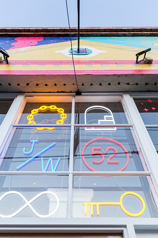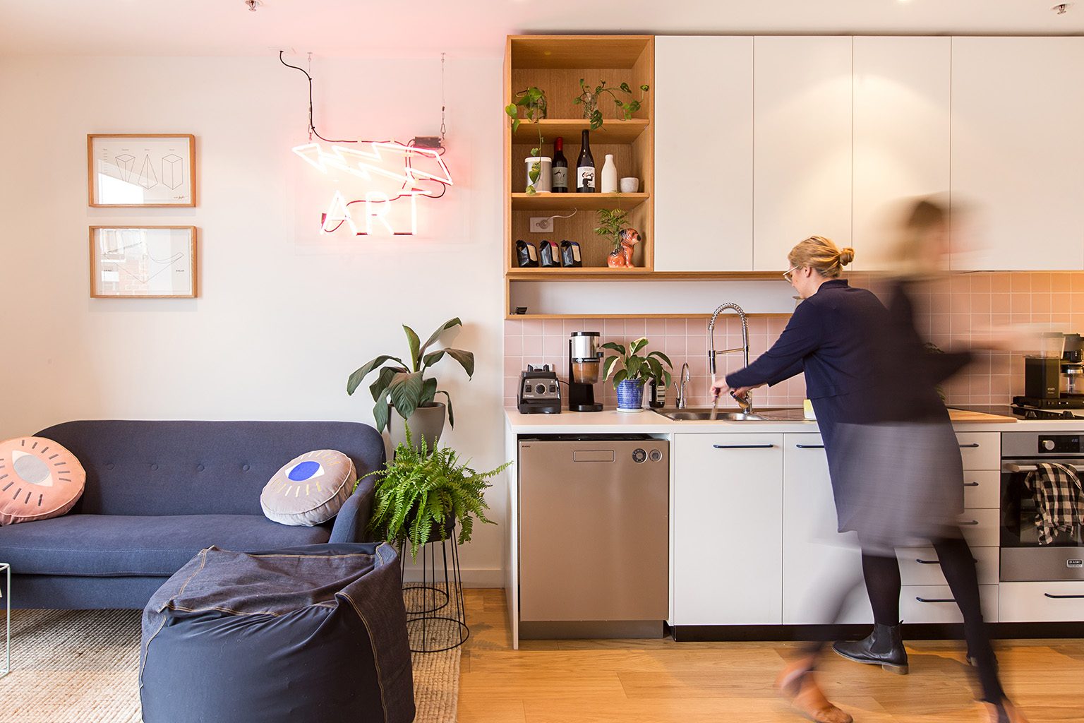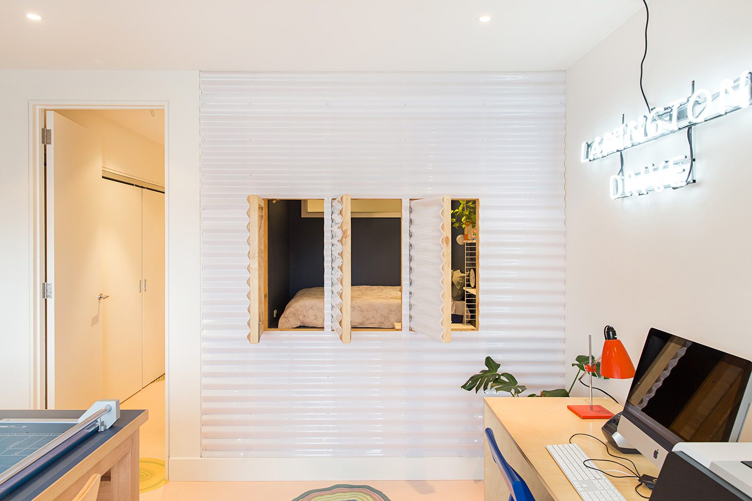 The Jacky Winter HQ is a distinctive project reflective of the companies’ culture, values and aesthetic. Split over three levels the Jacky Winter HQ houses Lamington Drive (Jacky Winter’s gallery), offices and a meeting room for the company’s 12 staff, a podcast recording room, and a self-contained ‘sleep room’ which can accommodate interstate artists and visitors for overnight stays.