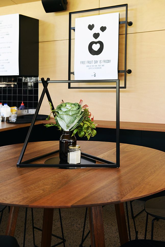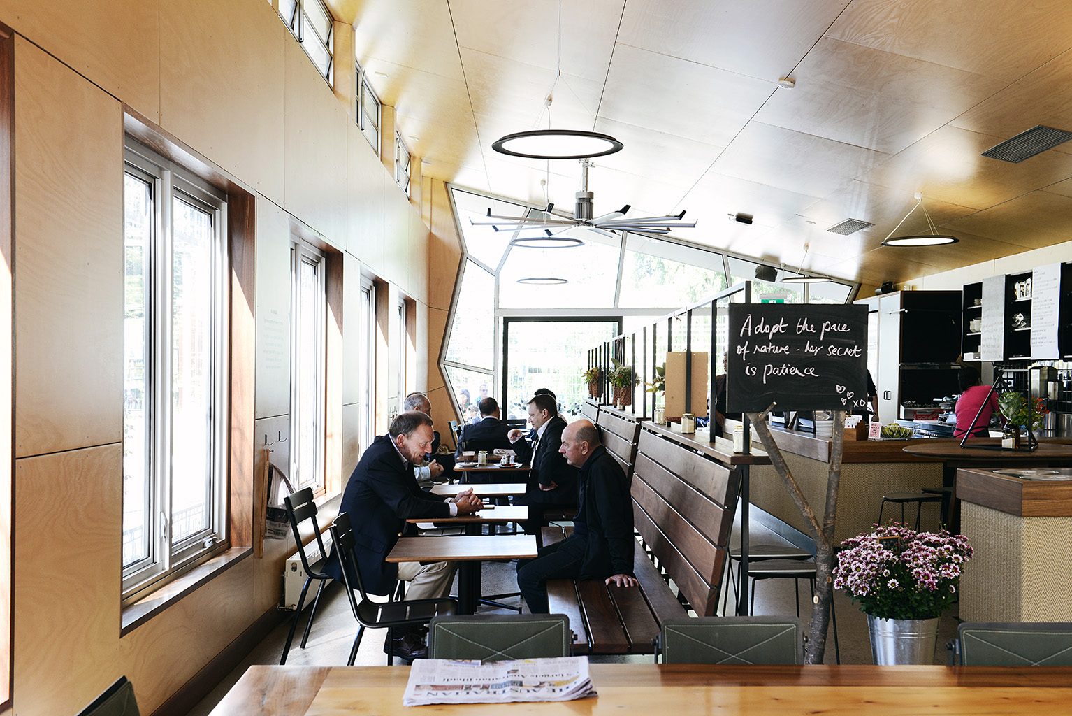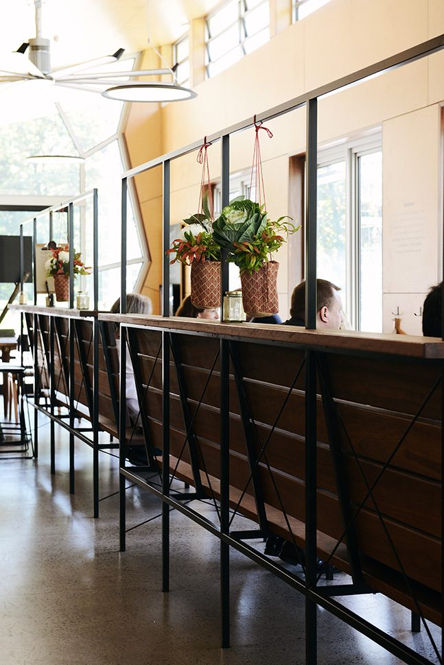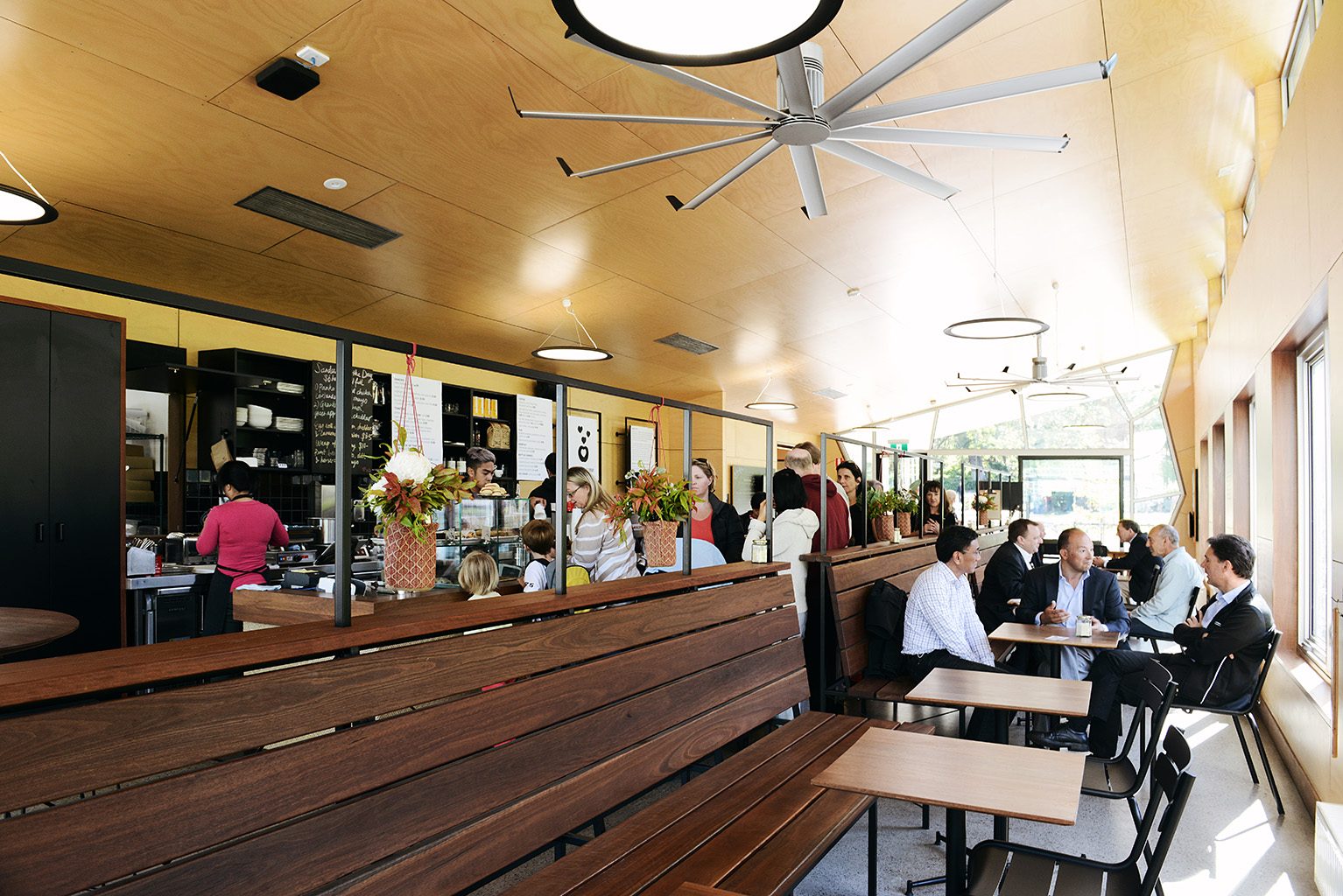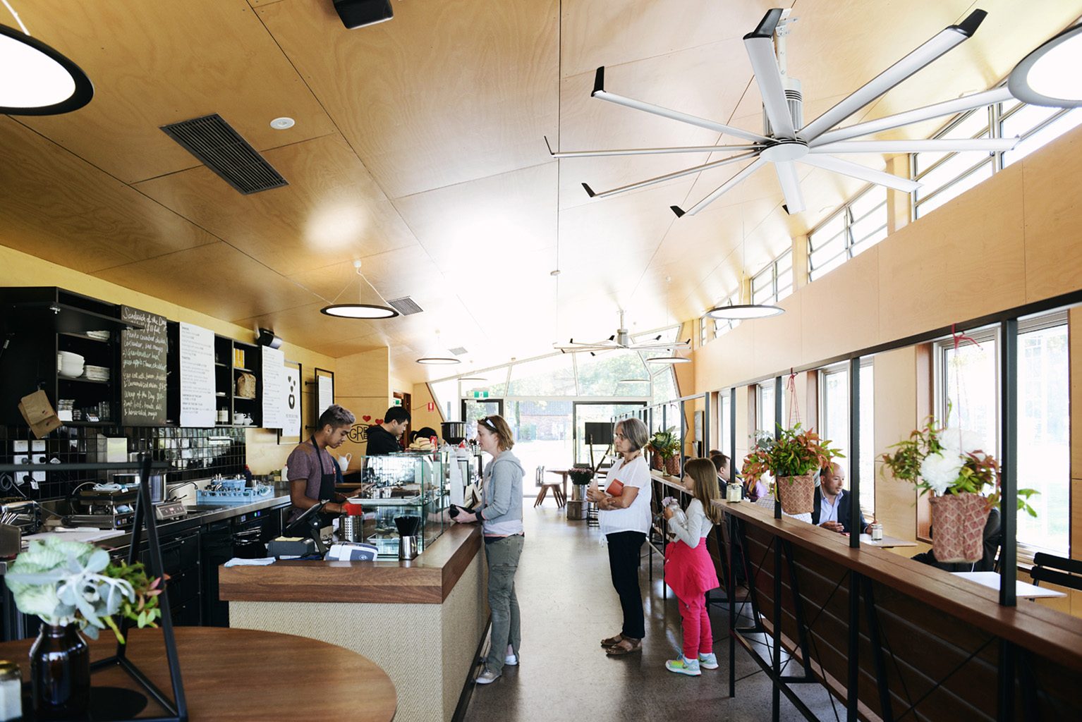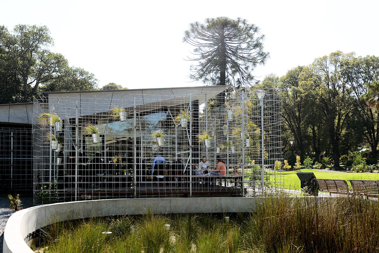 Situated in the gardens, the cafe maximises views and light using a raked ceiling and clerestory windows, positioning views from the tables to the outside gardens. The cafe also maximises the available space by utilising fixed and flexible furniture; with seating at a communal bench, central table and corner banquette. Seating is extended to an outdoor area with further views of the gardens.