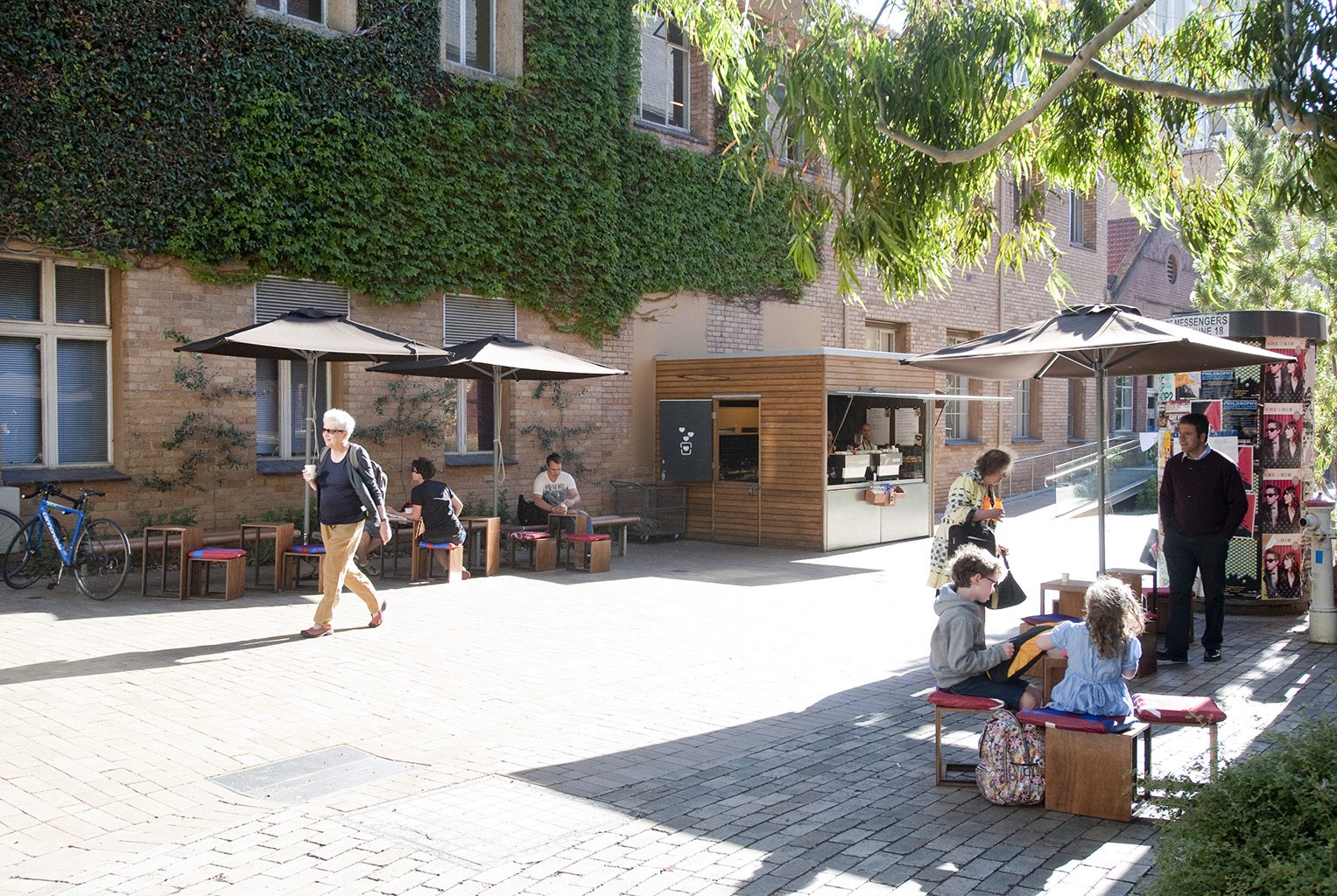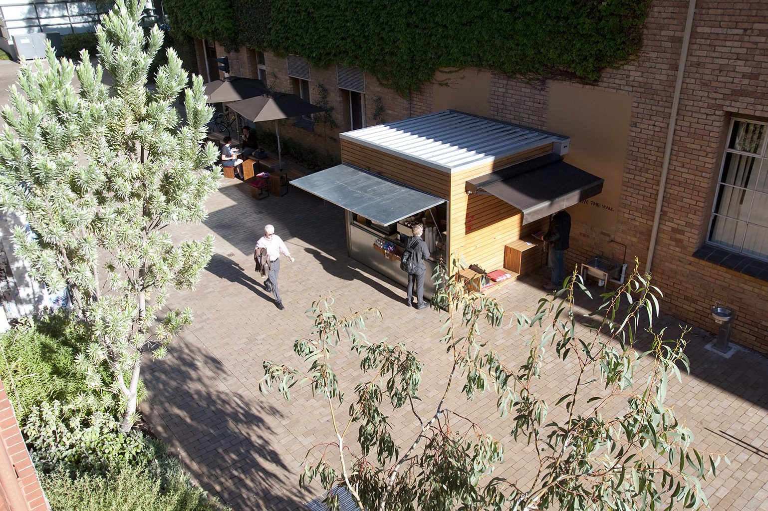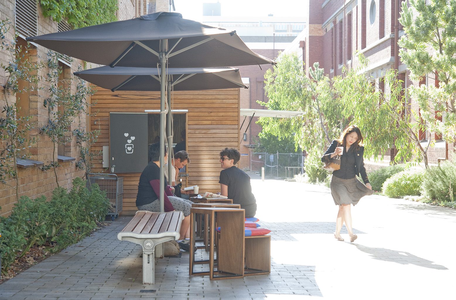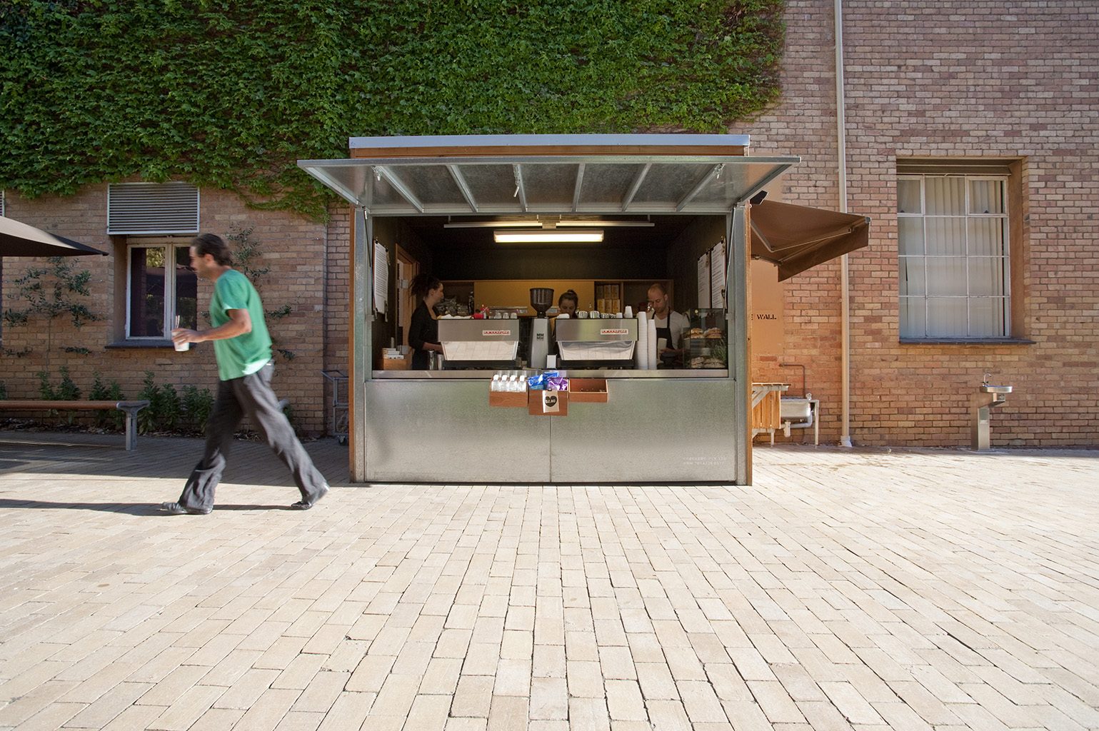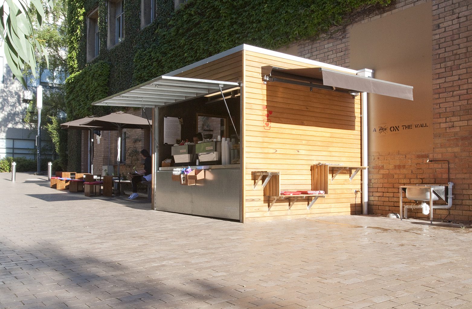 After years of braving the elements with an outdoor coffee cart (that we toiled away on a few years back), James finally had had enough. He asked us to design a small enclosure to keep him and his staff warm and at the same time create a bit of a ‘moment’ in a pretty dull laneway at the University. Although small, the 3m X 3m X 3m timber clad box has a personality of its own, with doors that open in all sort of orientations that become awnings and ‘crowd control’ barriers. Sitting in the public space it successfully walks the line between a found object and a piece of industrial design.