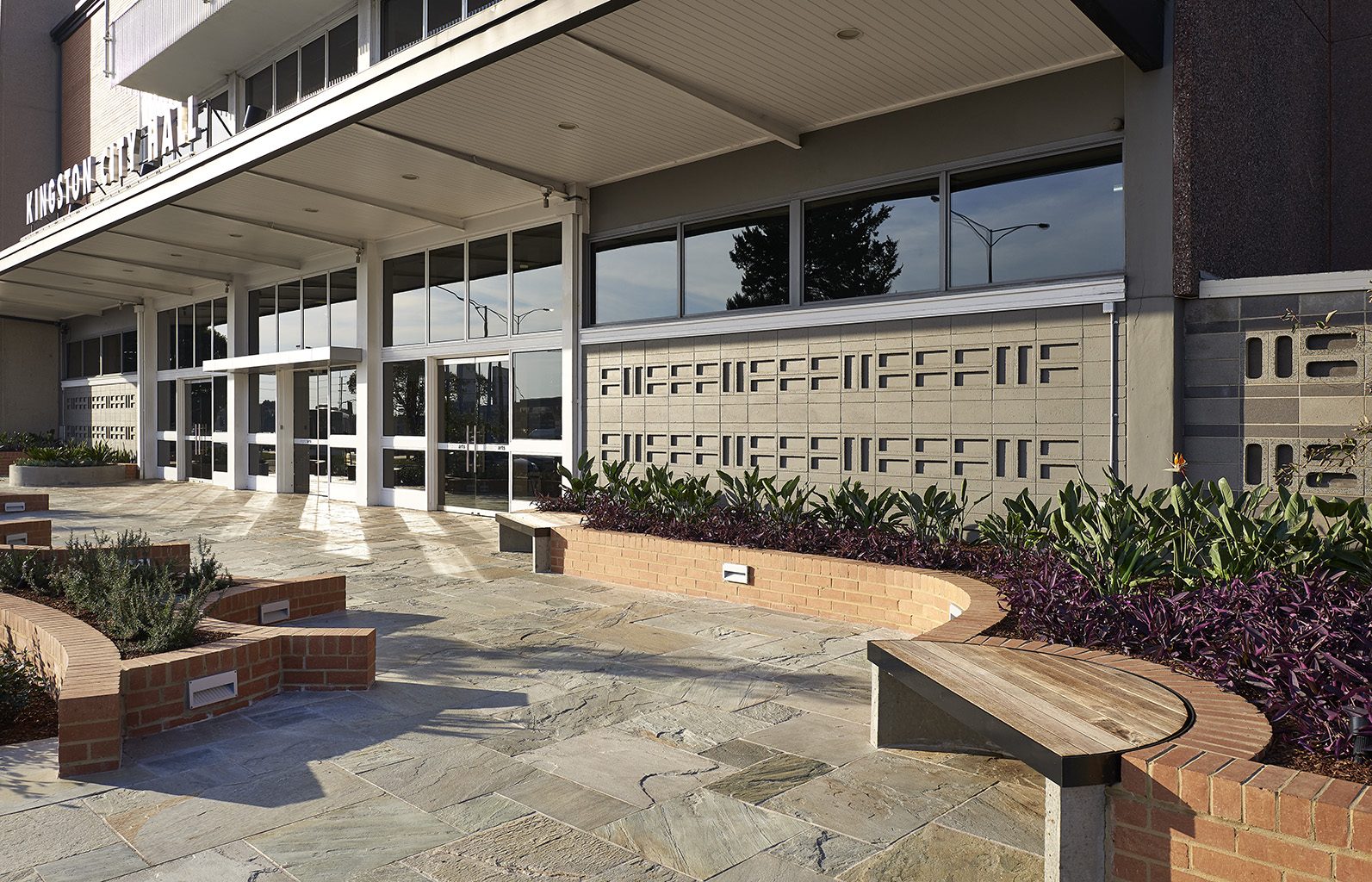 The Kingston City Hall Urban Plaza project changes the outdoor area directly outside and in between the City Hall and the Arts buildings from a thoroughfare into a place where the local community can not only interact with the arts and culture program produced by the arts team, but more importantly, with each other.