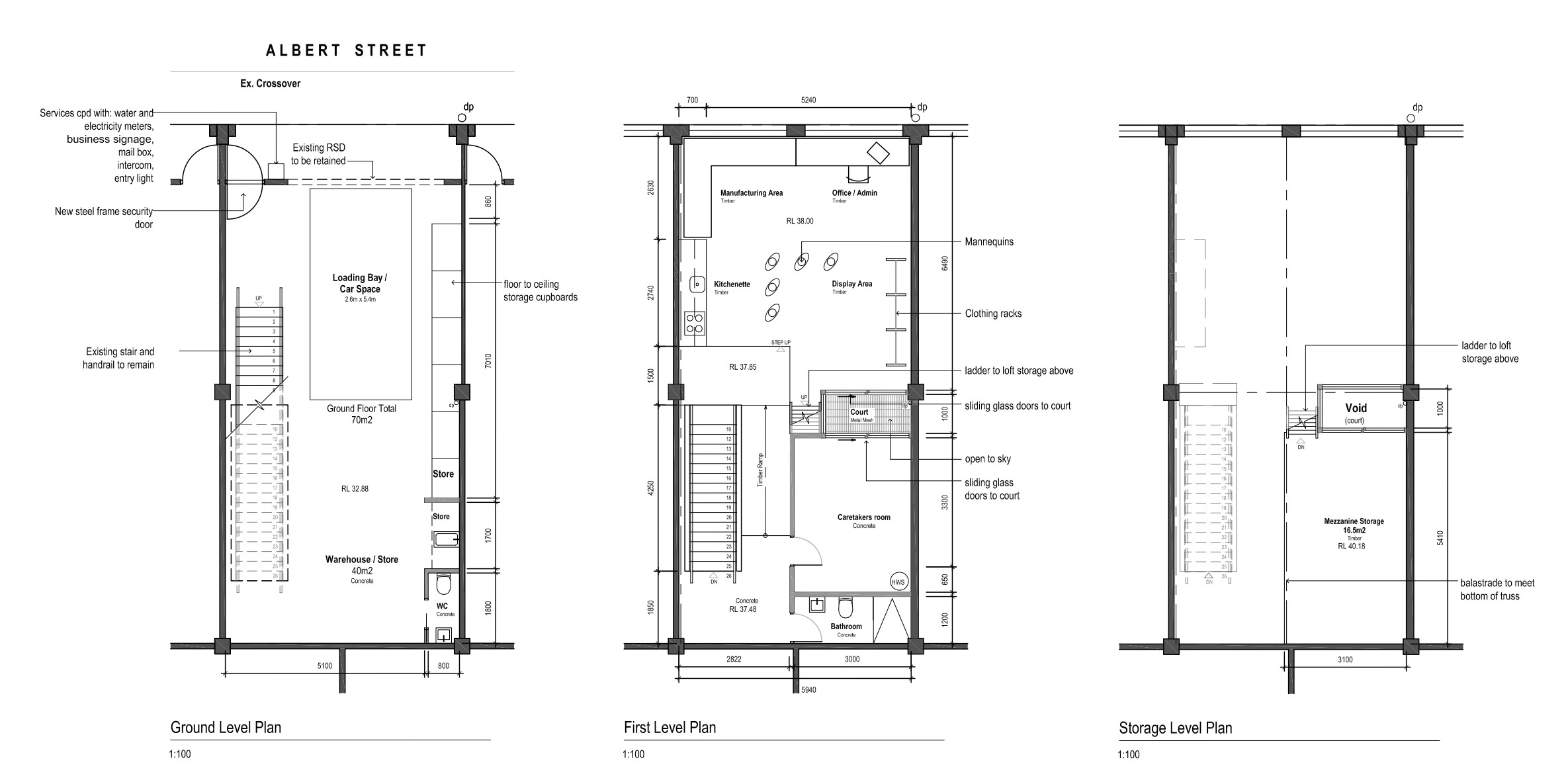 The existing structure gave us the bones. Ground floor became the florist studio, with a loading bay, floor-to-ceiling storage, and the original roller door retained at the front. Upstairs we carved out the residence, adding a mezzanine level to fit the living area within the volume of the first floor without losing the sense of height.