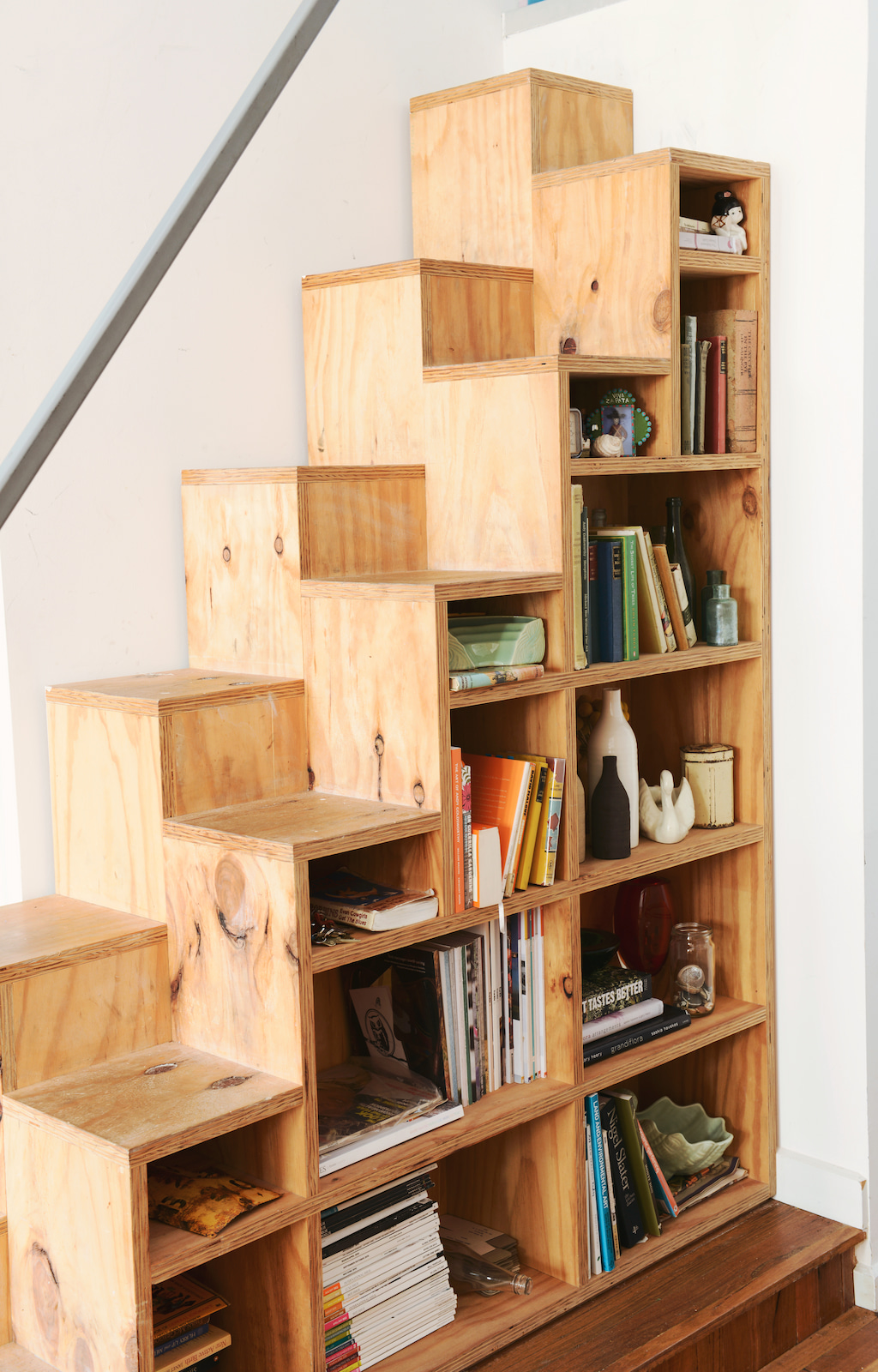 A light-well cut into the centre of the upper floor draws natural light down into the mezzanine and the bathroom below, and gives the sitting room a moment of visual relief from the surrounding walls. The stair doubles as a bookshelf, a detail that came directly from the brief and ended up defining the character of the space.