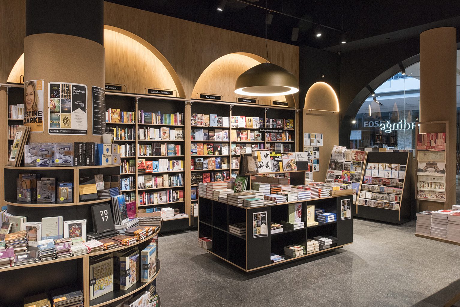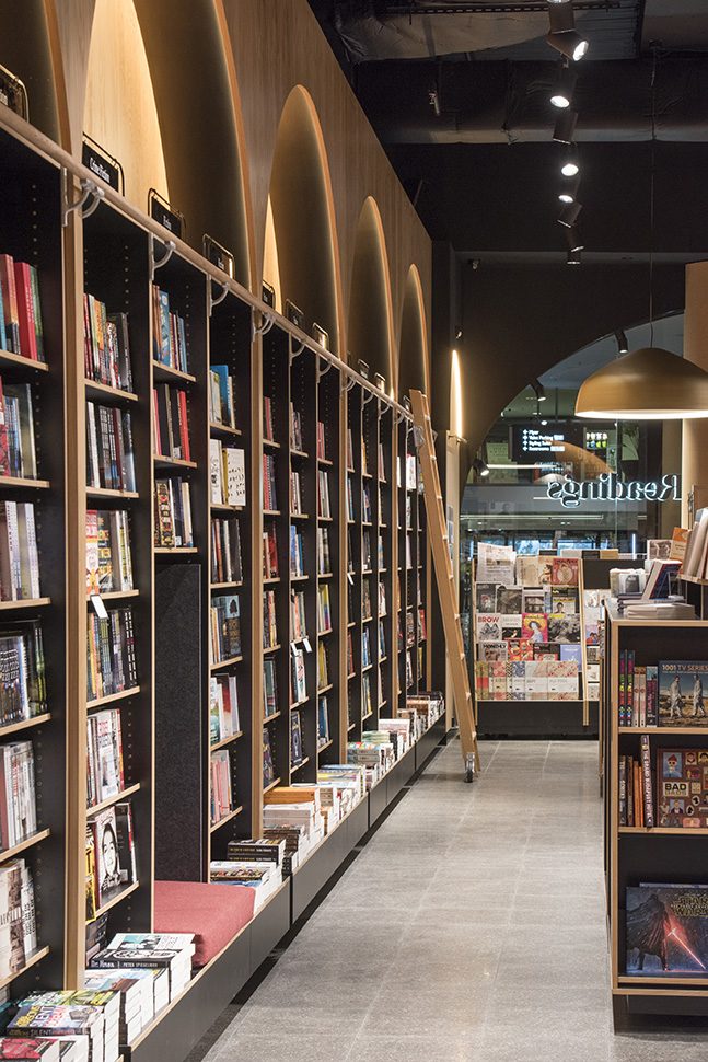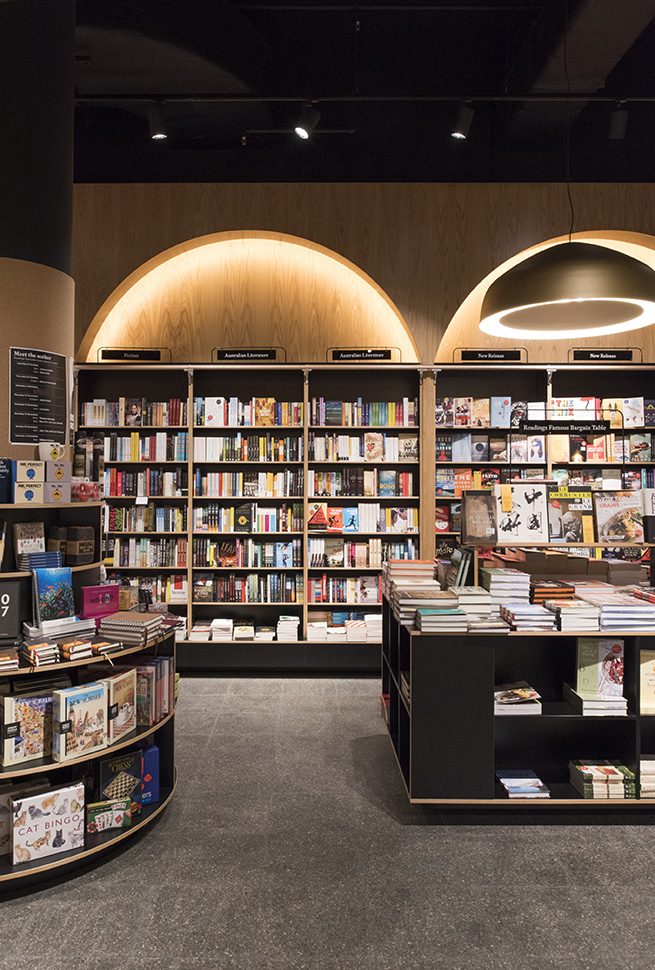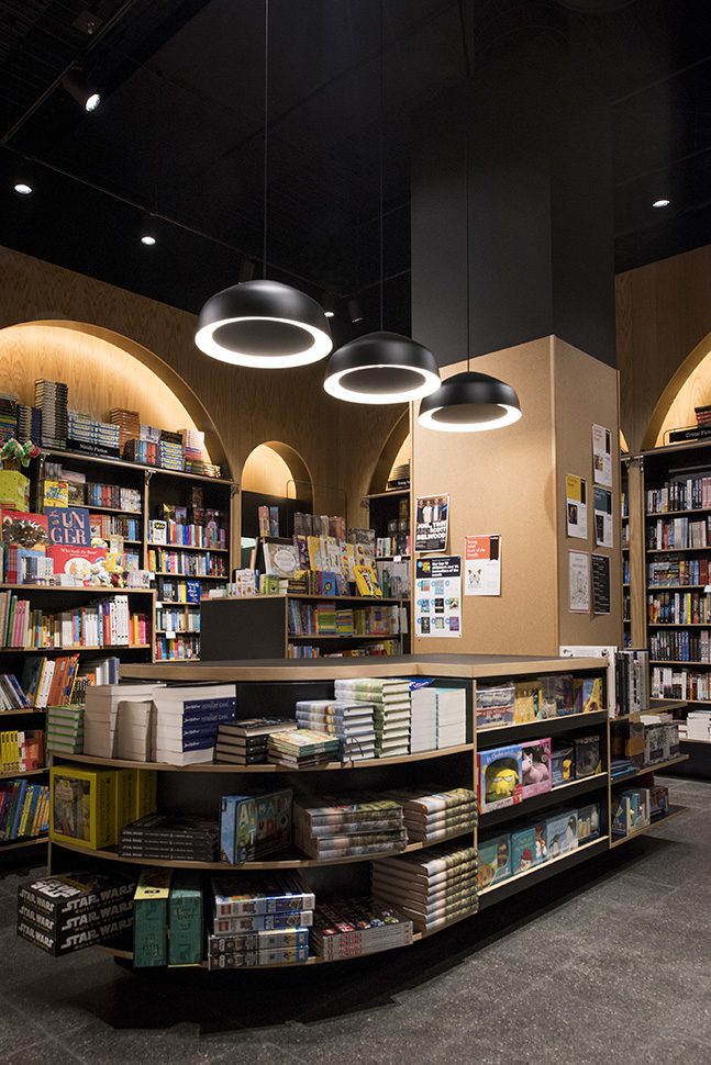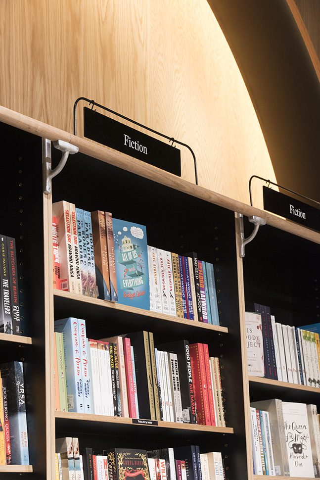Using the iconic aesthetic of the tiled street shopfront, the front facade playfully uses MDF arches to suggest the theme of books, without overtly implying their status. The interior is a further play on these arches – but in a purer form. Arched bookshelves lined with rolling ladders make up the bulk of the walls in the interior, whilst the use of black on light timber suggests an inviting nature to all visitors, to buy, or to read.