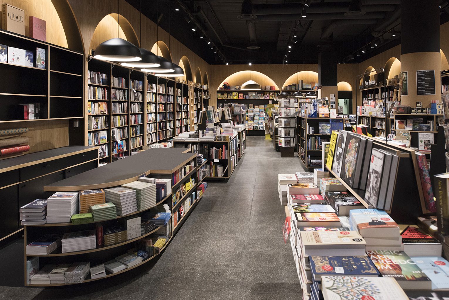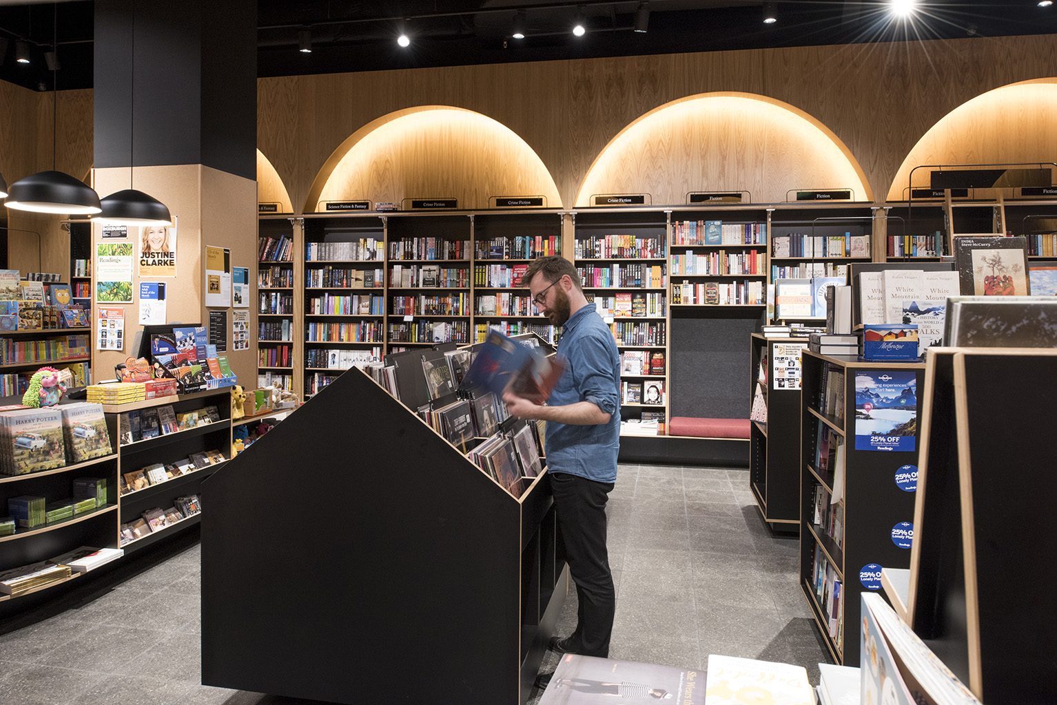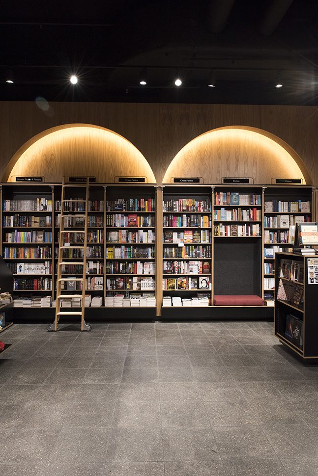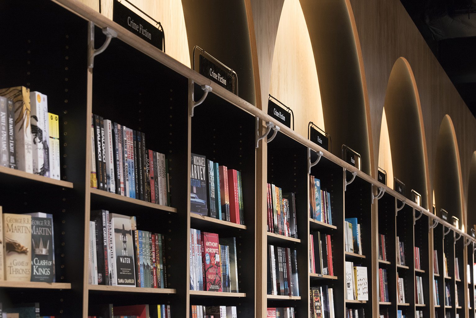 Using the iconic aesthetic of the tiled street shopfront, the front facade playfully uses MDF arches to suggest the theme of books, without overtly implying their status. The interior is a further play on these arches – but in a purer form. Arched bookshelves lined with rolling ladders make up the bulk of the walls in the interior, whilst the use of black on light timber suggests an inviting nature to all visitors, to buy, or to read.
