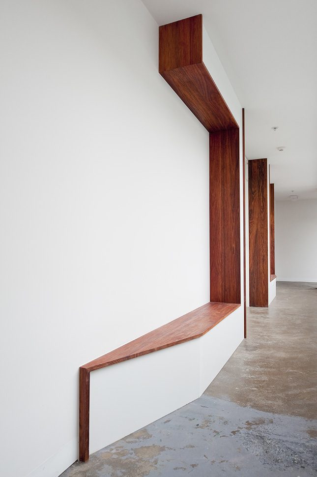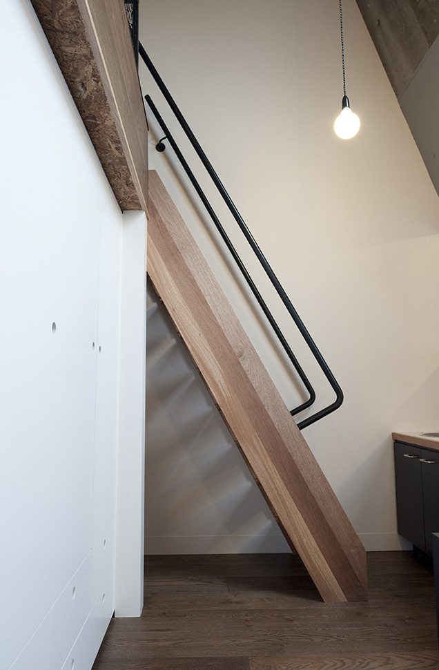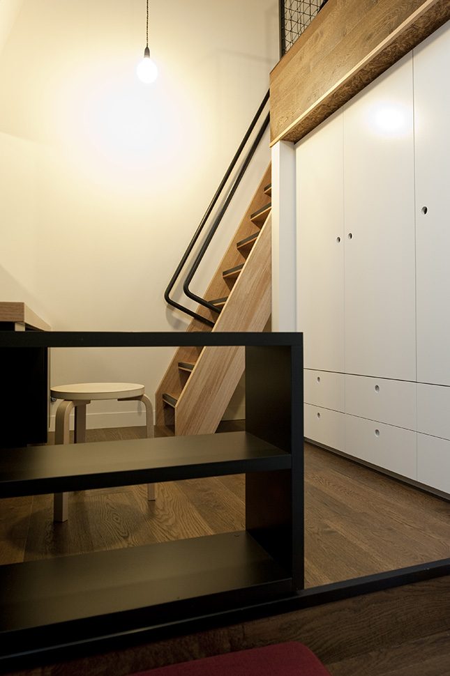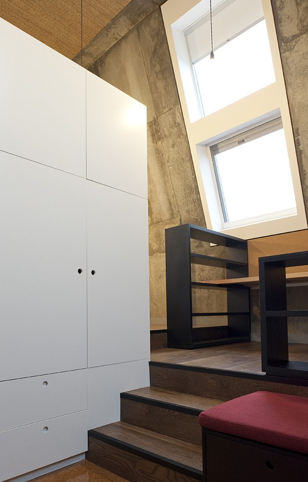 The plans are as small as twelve square metres. The architects designed specific built-in furniture to maximize liveability of the small spaces and use the unexpected generosity of the volume. The compact spaces are cleverly and tightly arranged, demonstrating that with care, specificity and tonnes of storage, very small spaces can make delightful homes. It is a telling departure from the notion of open planning and flexibility in institutional housing. To make such small spaces function, furniture must be fixed and specific to volume.