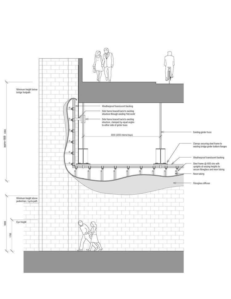 Neon lightning will be encased in a waterproof and robust light diffuser. The diffuser will be made from fibreglass on the bottom side of the light, facing the river. The other side of the diffuser will be made from a translucent acrylic, which will diffuse light up to and into the underside of the bridge, revealing its structure. The diffuser will be screw-fixed to a steel frame clamped to the existing structure of the bridge, causing no permanent damage to the historical bridge.