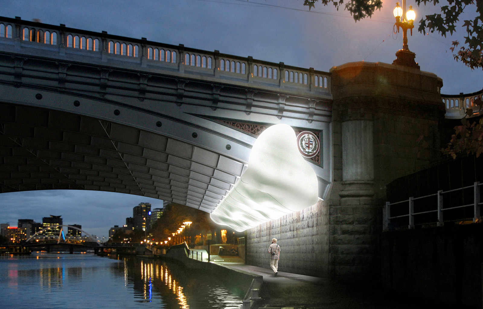 People walking over the bridge, along the north bank, adjacent to the rowing sheds, or along Southbank can see the installation during the day and, obviously, during the evening. They will be engaged with the light emanating from the diffuser itself and its reflection on the river’s surface. The undulating organic form of the diffuser will take on an increasingly random character when its reflection is viewed on the river’s surface.