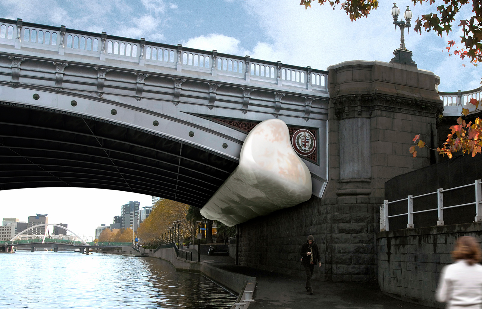 The space under the bridge could lose its character as an un-programmed space if ‘program’ were inserted. Hence, installing an ‘un-programmed’ piece of art makes sense. Simply put, viewing art installations prompts people to formulate their own experiences. Under the bridge, the strange attached creature will become a kind of poetry in people’s daily lives, a glance at the weird and wonderful before getting on with business. It does not dictate what experiences should be had; it simply asks people to view the piece and maybe, just maybe, ask the person next to them, ‘What’s it all about…’